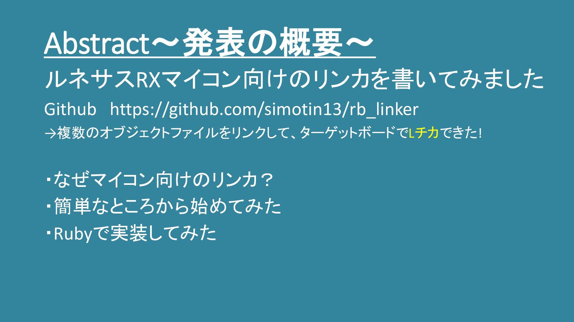 Abstract~発表の概要~ ・なぜマイコン向けのリンカ? ・簡単なところから始めてみた ・Rubyで実装してみた ルネサスRXマイコン向けのリンカを書いてみました Github https://github.com/simotin13/rb_linker →複数のオブジェクトファイルをリンクして、ターゲットボードでLチカできた!