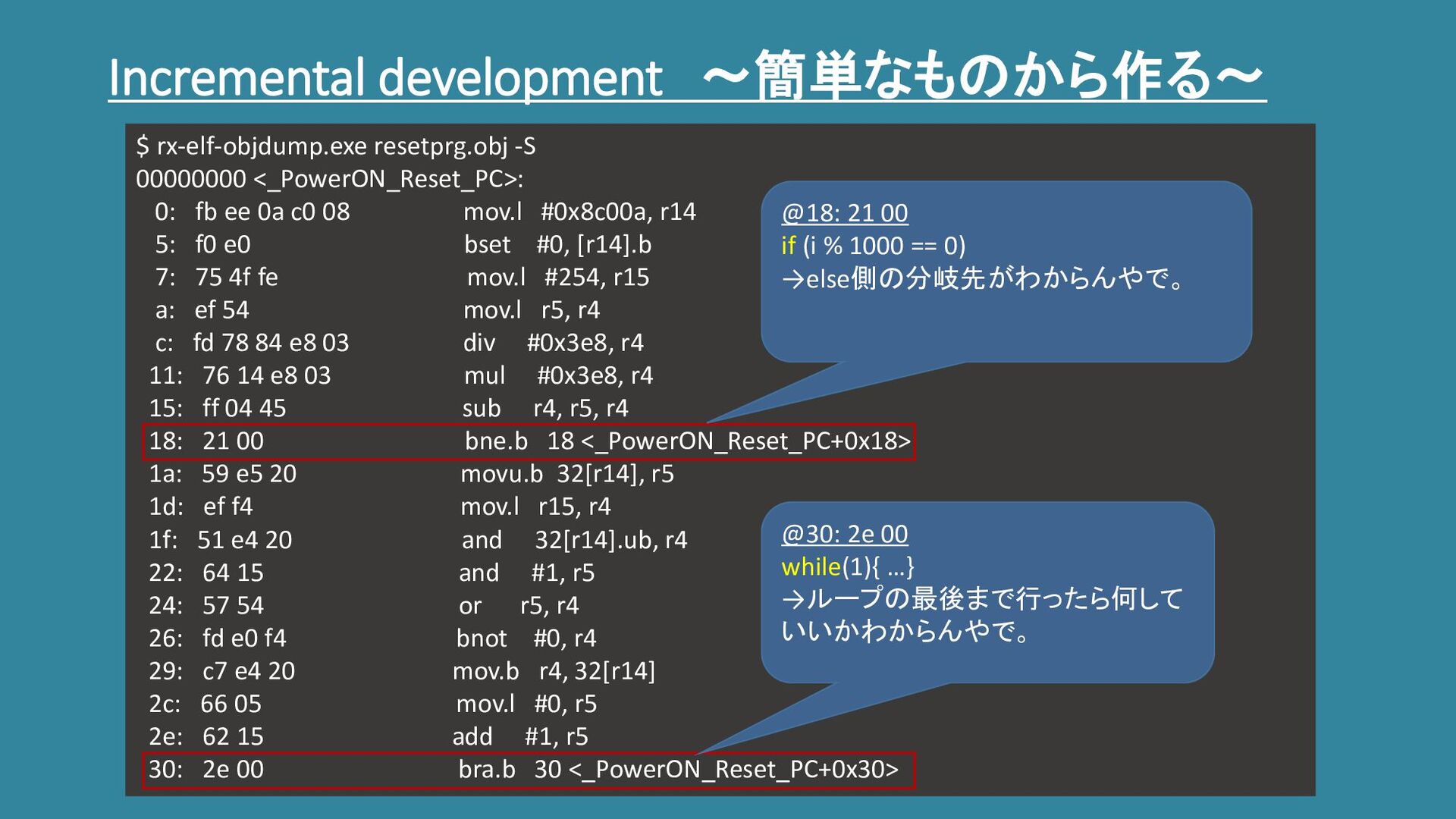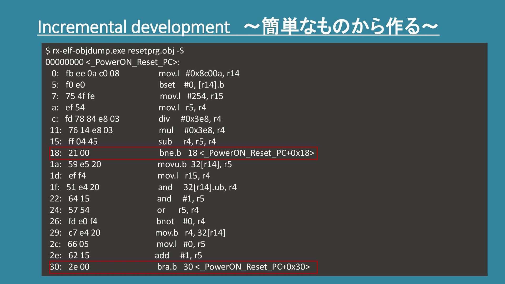Incremental development ~簡単なものから作る~ $ rx-elf-objdump.exe resetprg.obj -S 00000000 <_PowerON_Reset_PC>: 0: