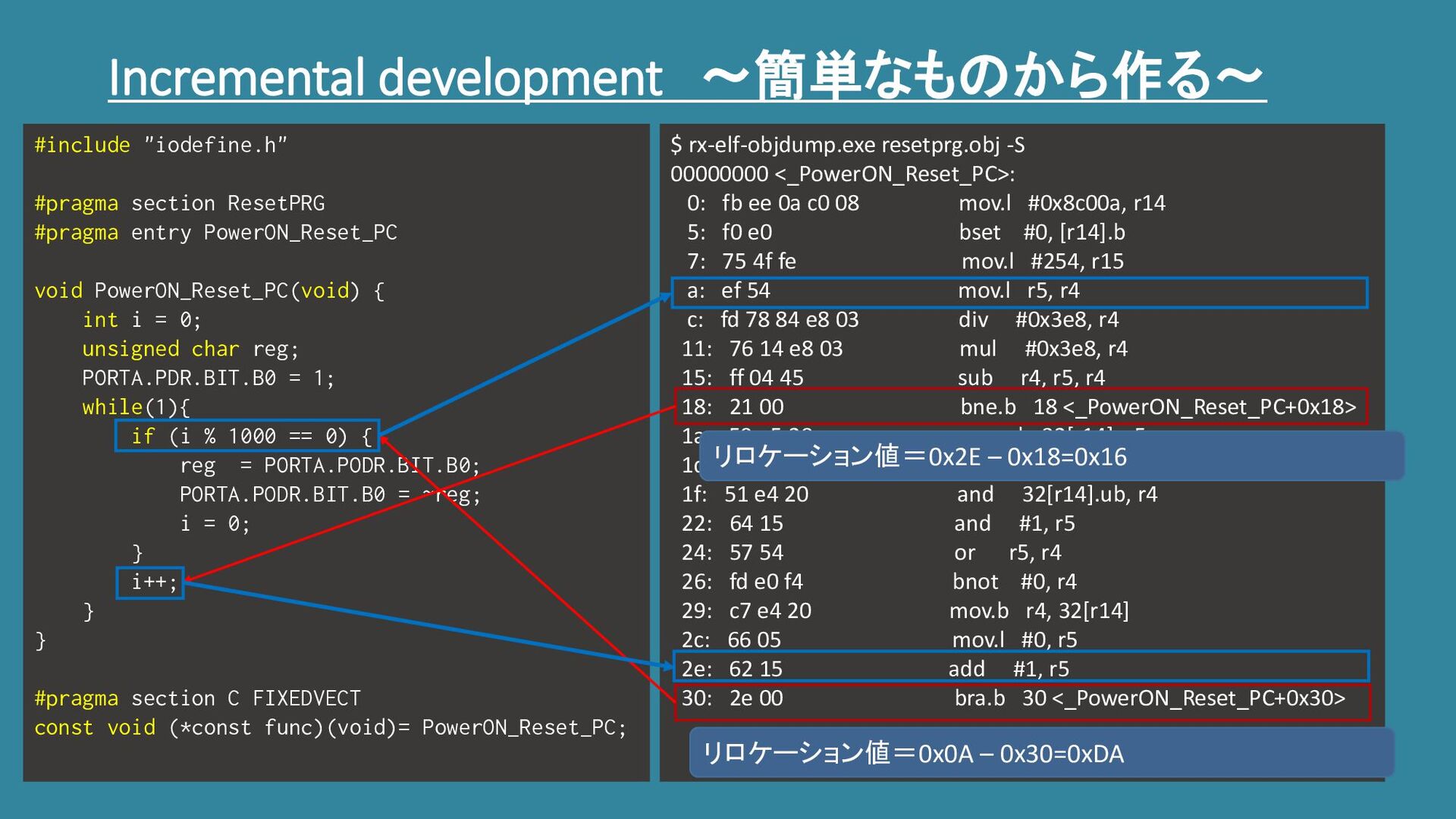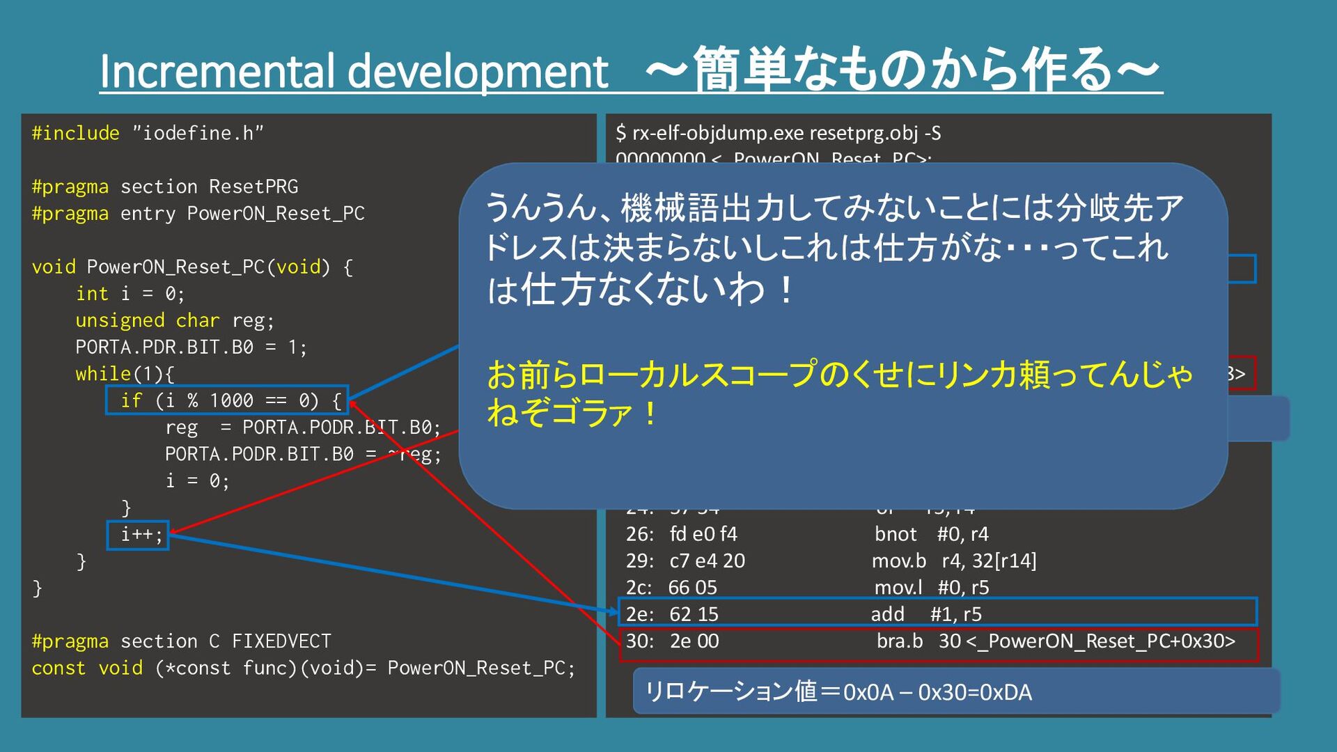 fb ee 0a c0 08 mov.l #0x8c00a, r14 5: f0 e0 bset #0, [r14].b 7: 75 4f fe mov.l #254, r15 a: ef 54 mov.l r5, r4 c: fd 78 84 e8 03 div #0x3e8, r4 11: 76 14 e8 03 mul #0x3e8, r4 15: ff 04 45 sub r4, r5, r4 18: 21 00 bne.b 18 <_PowerON_Reset_PC+0x18> 1a: 59 e5 20 movu.b 32[r14], r5 1d: ef f4 mov.l r15, r4 1f: 51 e4 20 and 32[r14].ub, r4 22: 64 15 and #1, r5 24: 57 54 or r5, r4 26: fd e0 f4 bnot #0, r4 29: c7 e4 20 mov.b r4, 32[r14] 2c: 66 05 mov.l #0, r5 2e: 62 15 add #1, r5 30: 2e 00 bra.b 30 <_PowerON_Reset_PC+0x30> #include "iodefine.h" #pragma section ResetPRG #pragma entry PowerON_Reset_PC void PowerON_Reset_PC(void) { int i = 0; unsigned char reg; PORTA.PDR.BIT.B0 = 1; while(1){ if (i % 1000 == 0) { reg = PORTA.PODR.BIT.B0; PORTA.PODR.BIT.B0 = ~reg; i = 0; } i++; } } #pragma section C FIXEDVECT const void (*const func)(void)= PowerON_Reset_PC; リロケーション値=0x2E – 0x18=0x16 リロケーション値=0x0A – 0x30=0xDA うんうん、機械語出力してみないことには分岐先ア ドレスは決まらないしこれは仕方がな・・・ってこれ は仕方なくないわ! お前らローカルスコープのくせにリンカ頼ってんじゃ ねぞゴラァ!