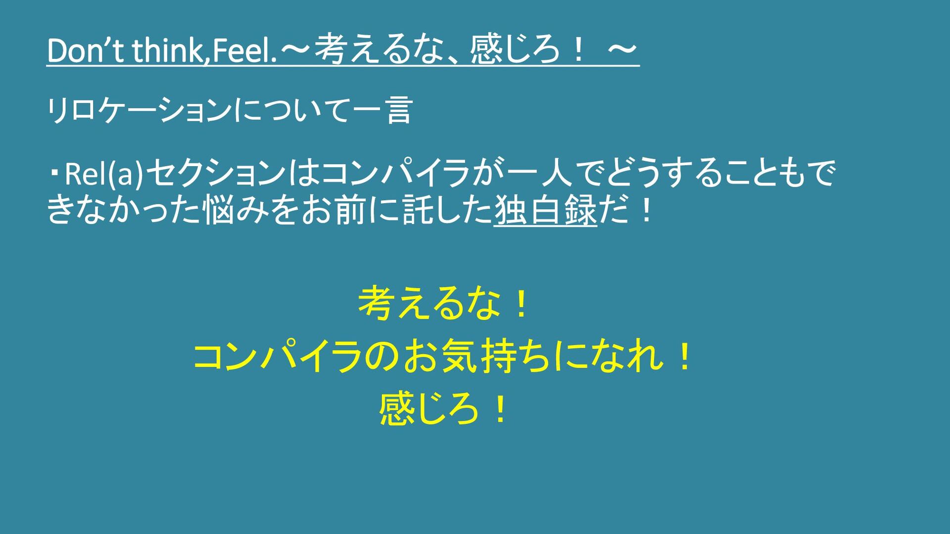Don’t think,Feel.~考えるな、感じろ! ~ ・Rel(a)セクションはコンパイラが一人でどうすることもで きなかった悩みをお前に託した独白録だ! 考えるな! コンパイラのお気持ちになれ! 感じろ! リロケーションについて一言