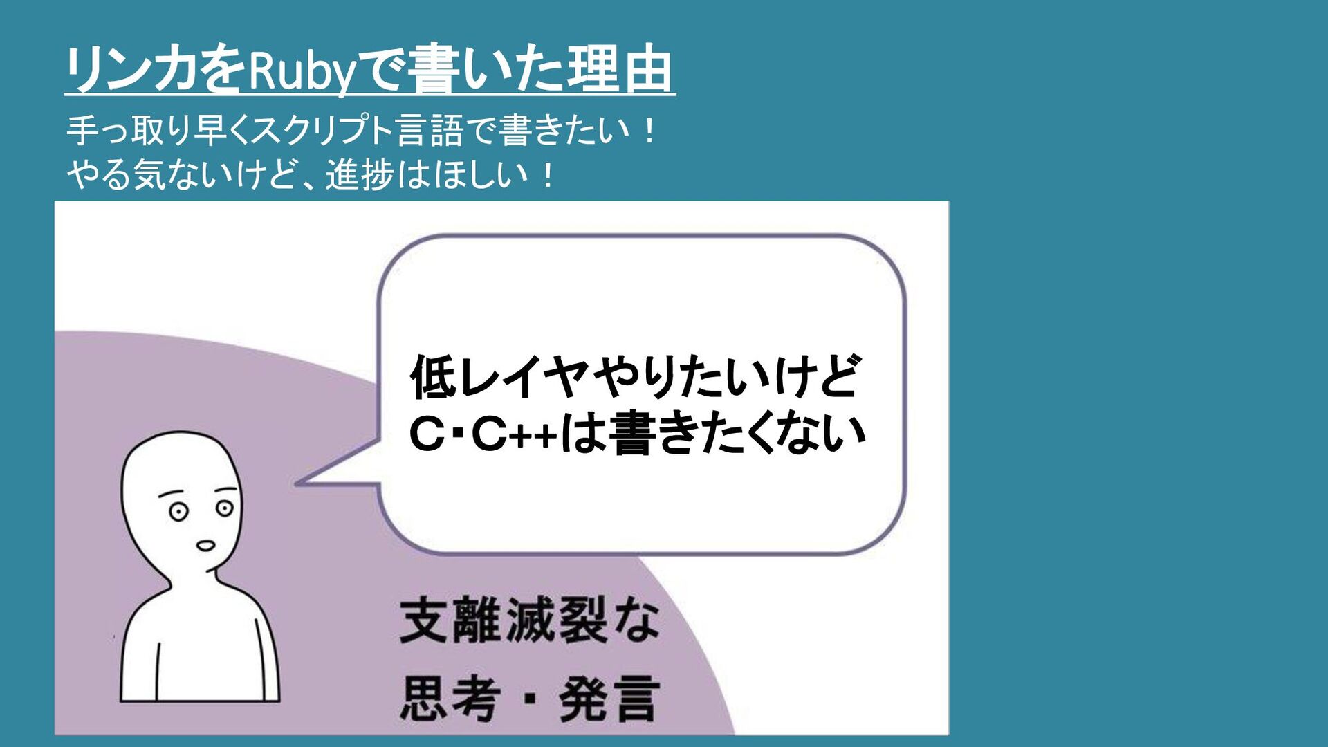 リンカをRubyで書いた理由 手っ取り早くスクリプト言語で書きたい! やる気ないけど、進捗はほしい! 低レイヤやりたいけど C・C++は書きたくない