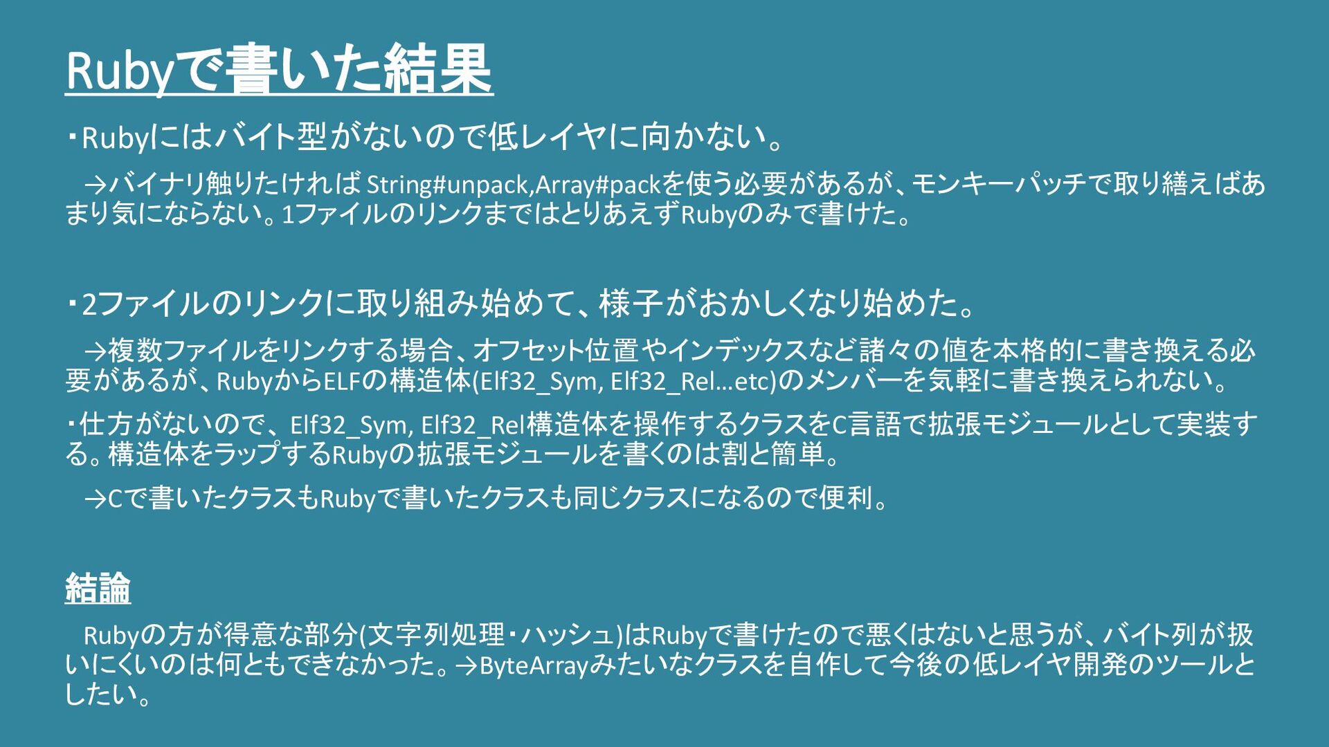 Rubyで書いた結果 ・Rubyにはバイト型がないので低レイヤに向かない。 →バイナリ触りたければ String#unpack,Array#packを使う必要があるが、モンキーパッチで取り繕えばあ まり気にならない。1ファイルのリンクまではとりあえずRubyのみで書けた。 ・2ファイルのリンクに取り組み始めて、様子がおかしくなり始めた。 →複数ファイルをリンクする場合、オフセット位置やインデックスなど諸々の値を本格的に書き換える必 要があるが、RubyからELFの構造体(Elf32_Sym, Elf32_Rel…etc)のメンバーを気軽に書き換えられない。 ・仕方がないので、