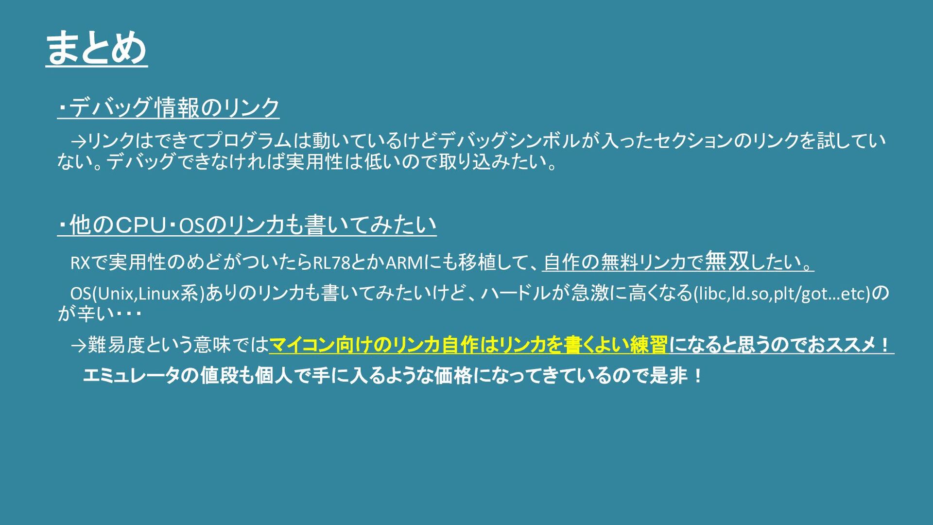 まとめ ・デバッグ情報のリンク →リンクはできてプログラムは動いているけどデバッグシンボルが入ったセクションのリンクを試してい ない。デバッグできなければ実用性は低いので取り込みたい。 ・他のCPU・OSのリンカも書いてみたい RXで実用性のめどがついたらRL78とかARMにも移植して、自作の無料リンカで無双したい。 OS(Unix,Linux系)ありのリンカも書いてみたいけど、ハードルが急激に高くなる(libc,ld.so,plt/got…etc)の が辛い・・・ →難易度という意味ではマイコン向けのリンカ自作はリンカを書くよい練習になると思うのでおススメ! エミュレータの値段も個人で手に入るような価格になってきているので是非!