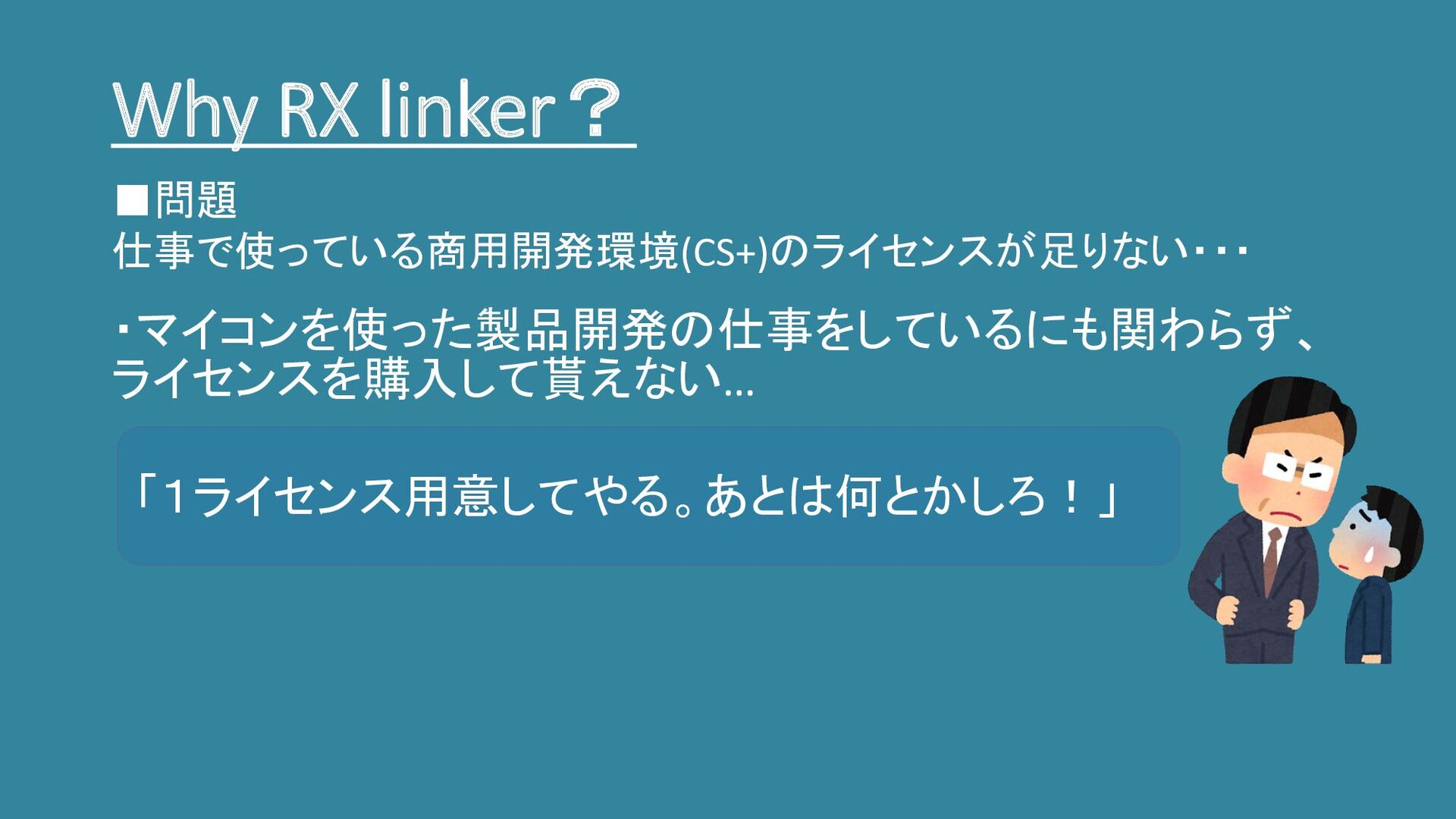 Why RX linker? ・マイコンを使った製品開発の仕事をしているにも関わらず、 ライセンスを購入して貰えない… ▪問題 仕事で使っている商用開発環境(CS+)のライセンスが足りない・・・ 「1ライセンス用意してやる。あとは何とかしろ!」