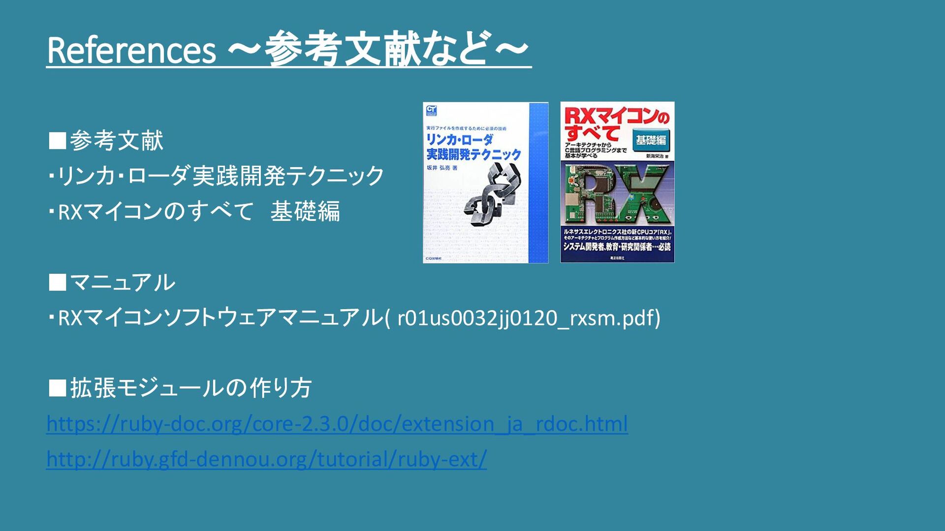 References ~参考文献など~ ▪参考文献 ・リンカ・ローダ実践開発テクニック ・RXマイコンのすべて 基礎編 ▪マニュアル ・RXマイコンソフトウェアマニュアル( r01us0032jj0120_rxsm.pdf) ▪拡張モジュールの作り方