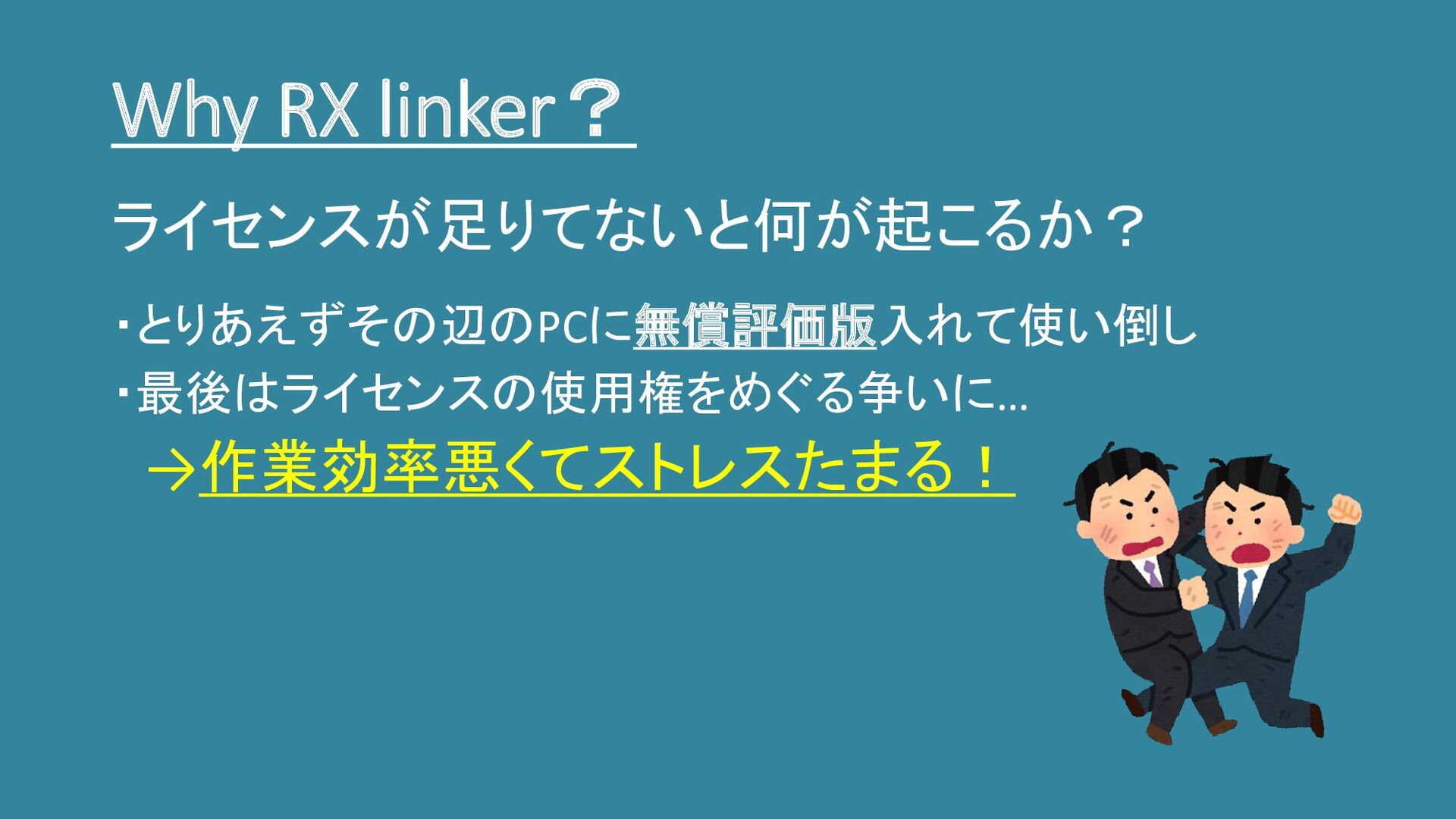 Why RX linker? ・とりあえずその辺のPCに無償評価版入れて使い倒し ・最後はライセンスの使用権をめぐる争いに… →作業効率悪くてストレスたまる! ライセンスが足りてないと何が起こるか?