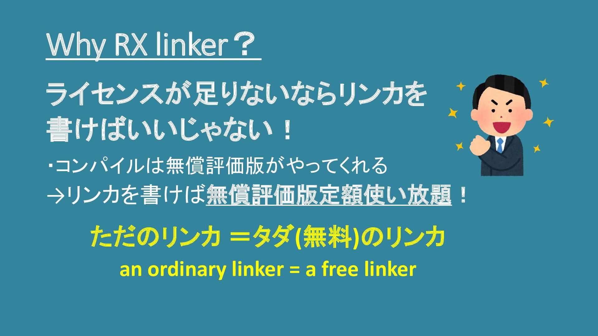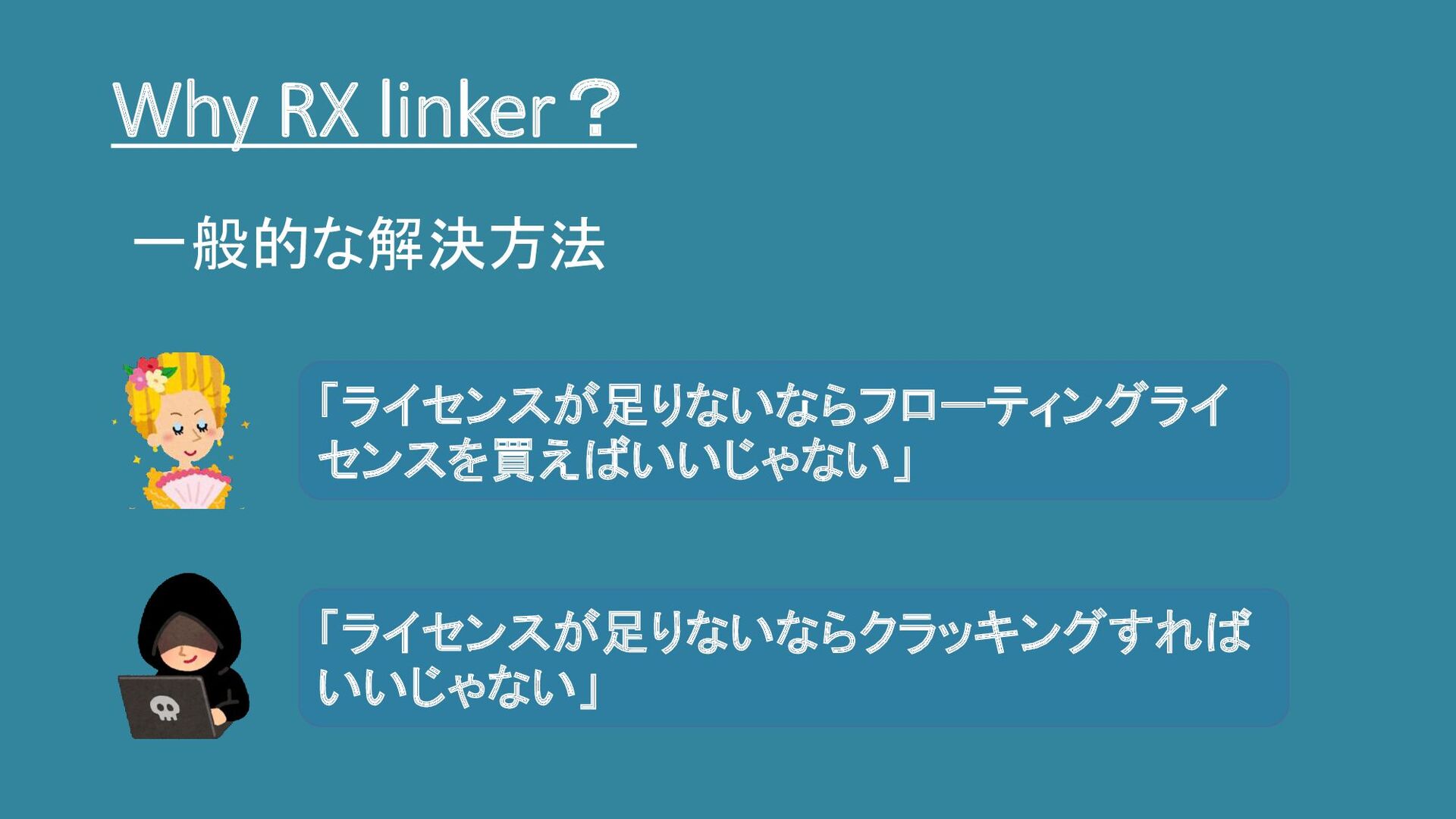 Why RX linker? 「ライセンスが足りないならフローティングライ センスを買えばいいじゃない」 「ライセンスが足りないならクラッキングすれば いいじゃない」 一般的な解決方法