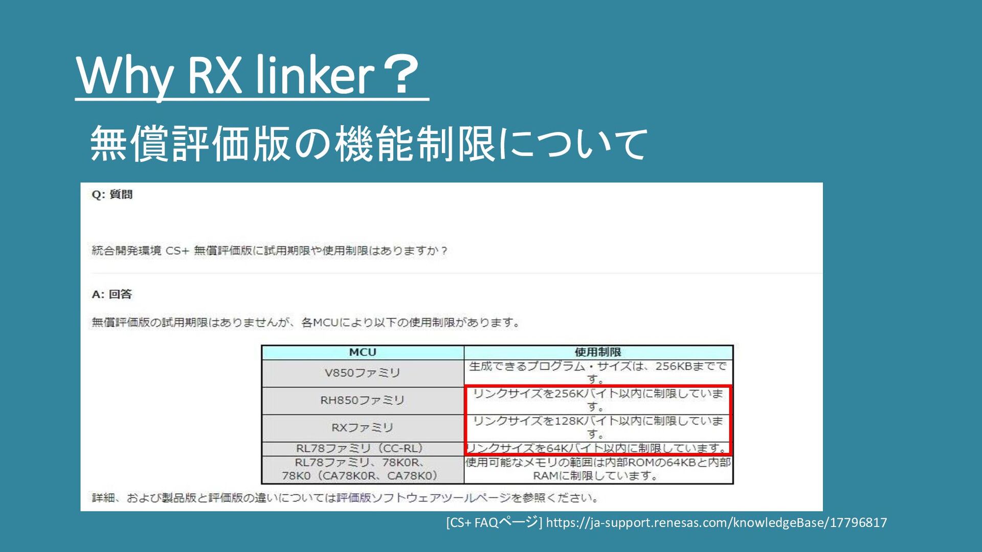 Why RX linker? [CS+ FAQページ] https://ja-support.renesas.com/knowledgeBase/17796817 無償評価版の機能制限について