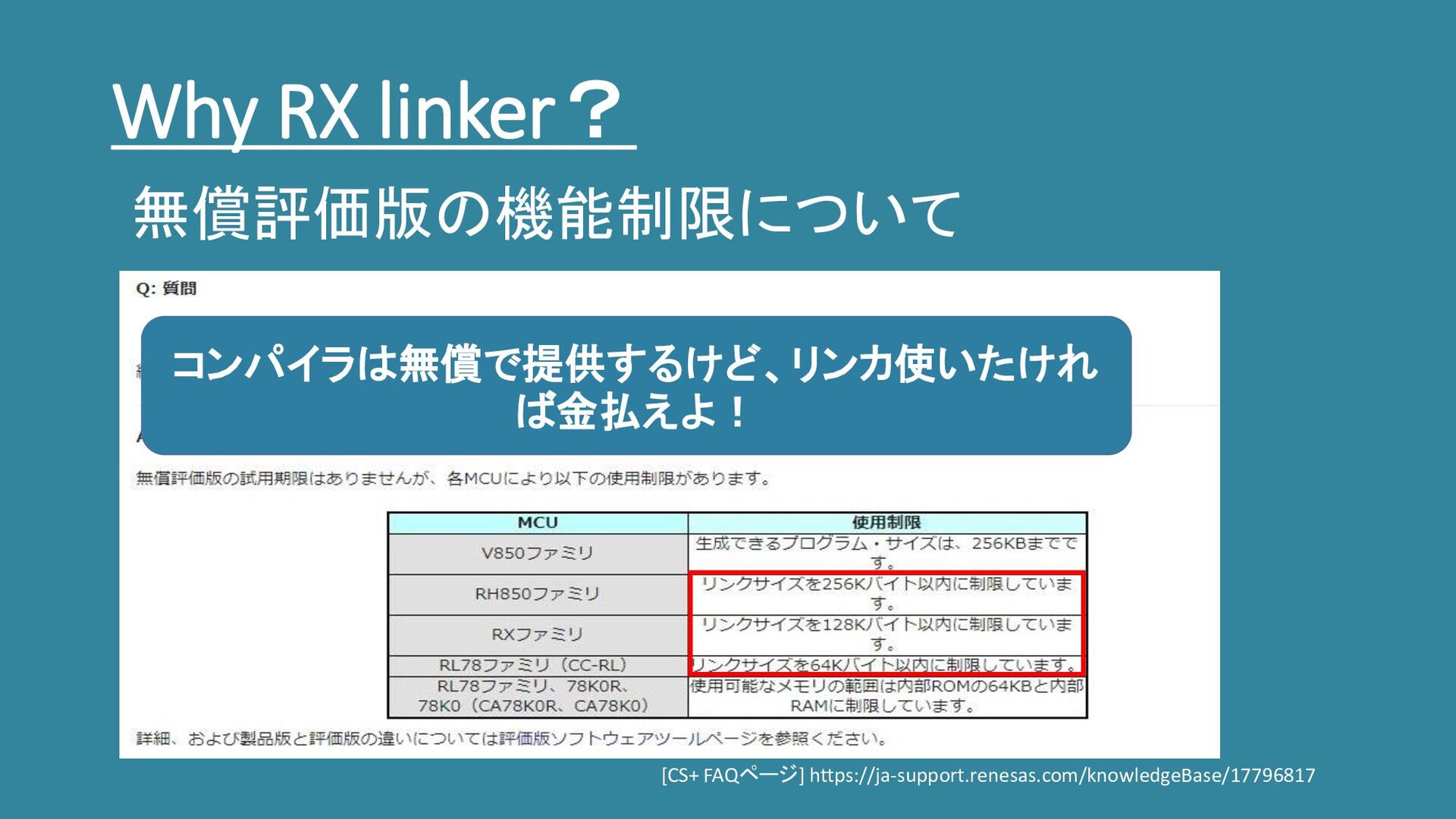 Why RX linker? [CS+ FAQページ] https://ja-support.renesas.com/knowledgeBase/17796817 無償評価版の機能制限について コンパイラは無償で提供するけど、リンカ使いたけれ ば金払えよ!