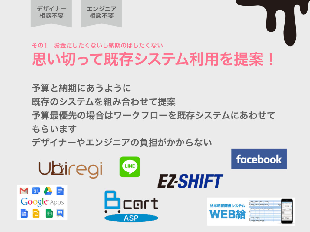 ༧ࢉͱೲظʹ͋͏Α͏ʹ طଘͷγεςϜΛΈ߹ΘͤͯఏҊ ༧ࢉ࠷༏ઌͷ߹ϫʔΫϑϩʔΛطଘγεςϜʹ͋Θͤͯ Β͍·͢ σβΠφʔΤϯδχΞͷෛ୲͕͔͔Βͳ͍ ͦͷɹ͓ۚͩͨ͘͠ͳ͍͠ೲظͷͨ͘͠ͳ͍ ࢥ͍ͬͯطଘγεςϜར༻ΛఏҊʂ ΤϯδχΞ ૬ஊෆཁ σβΠφʔ