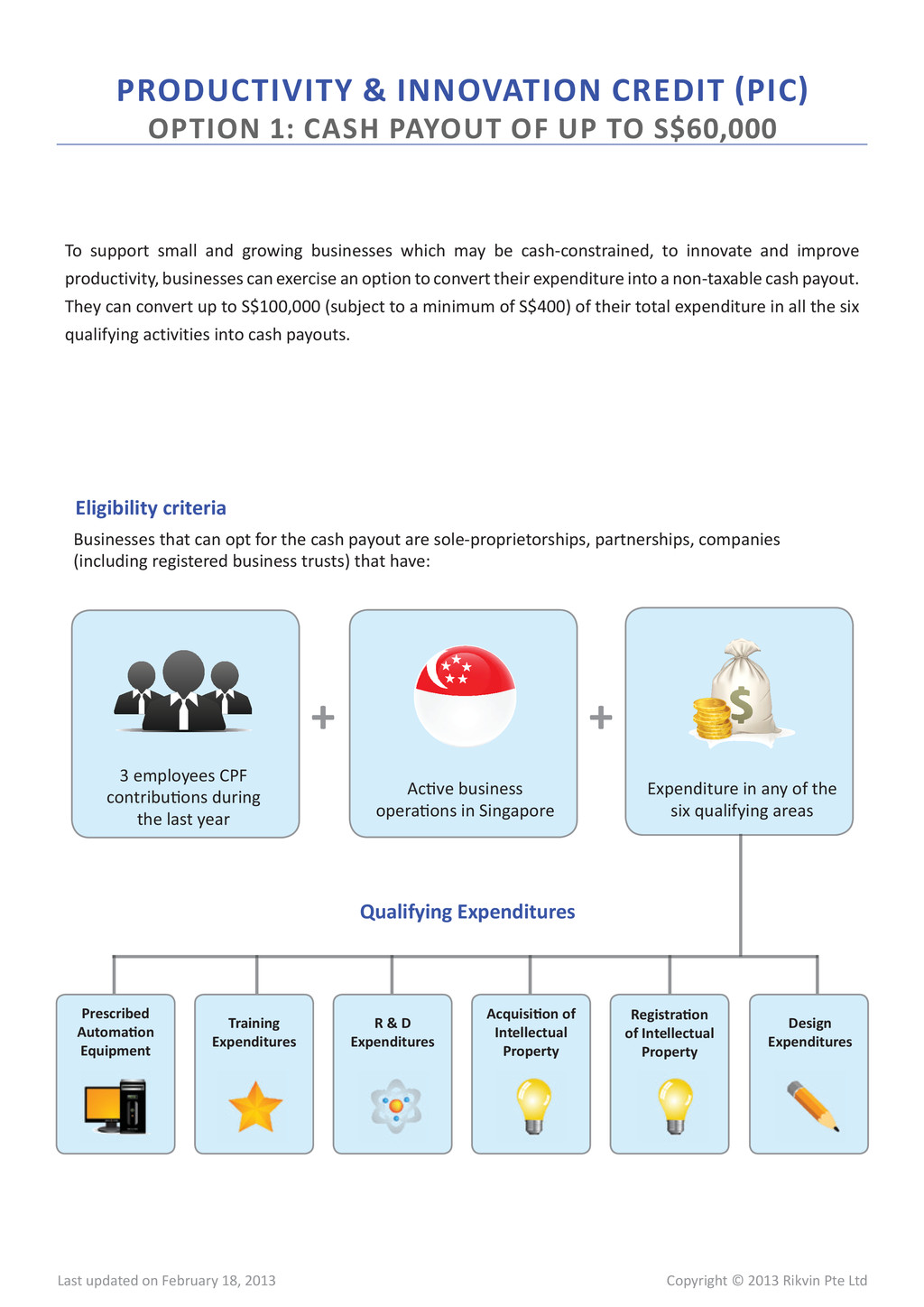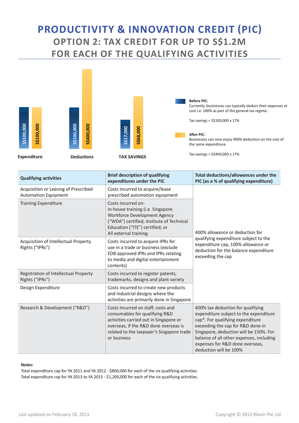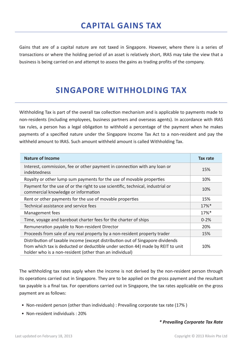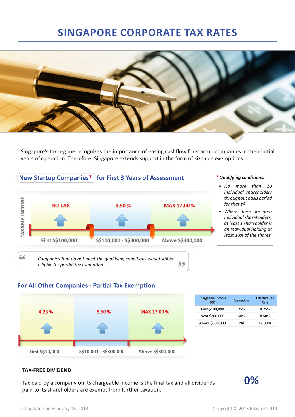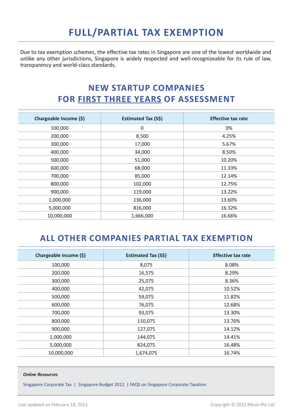 18, 2013 Chargeable Income ($) Estimated Tax (S$) Effective tax rate 100,000 8,075 8.08% 200,000 16,575 8.29% 300,000 25,075 8.36% 400,000 42,075 10.52% 500,000 59,075 11.82% 600,000 76,075 12.68% 700,000 93,075 13.30% 800,000 110,075 13.76% 900,000 127,075 14.12% 1,000,000 144,075 14.41% 5,000,000 824,075 16.48% 10,000,000 1,674,075 16.74% Chargeable Income ($) Estimated Tax (S$) Effective tax rate 100,000 0 0% 200,000 8,500 4.25% 300,000 17,000 5.67% 400,000 34,000 8.50% 500,000 51,000 10.20% 600,000 68,000 11.33% 700,000 85,000 12.14% 800,000 102,000 12.75% 900,000 119,000 13.22% 1,000,000 136,000 13.60% 5,000,000 816,000 16.32% 10,000,000 1,666,000 16.66% NEW STARTUP COMPANIES FOR FIRST THREE YEARS OF ASSESSMENT ALL OTHER COMPANIES PARTIAL TAX EXEMPTION Online Resources Singapore Corporate Tax | Singapore Budget 2012 | FAQS on Singapore Corporate Taxation Due to tax exemption schemes, the effective tax rates in Singapore are one of the lowest worldwide and unlike any other jurisdictions, Singapore is widely respected and well-recognizeable for its rule of law, transparency and world-class standards. FULL/PARTIAL TAX EXEMPTION