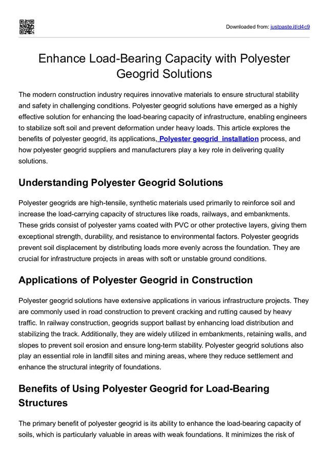The modern construction industry requires innovative materials to ensure structural stability and safety in challenging conditions. Polyester geogrid solutions have emerged as a highly effective solution for enhancing the load-bearing capacity of infrastructure, enabling engineers to stabilize soft soil and prevent deformation under heavy loads. This article explores the benefits of polyester geogrid, its applications, Polyester geogrid installation process, and how polyester geogrid suppliers and manufacturers play a key role in delivering quality solutions. Understanding Polyester Geogrid Solutions Polyester geogrids are high-tensile, synthetic materials used primarily to reinforce soil and increase the load-carrying capacity of structures like roads, railways, and embankments. These grids consist of polyester yarns coated with PVC or other protective layers, giving them exceptional strength, durability, and resistance to environmental factors. Polyester geogrids prevent soil displacement by distributing loads more evenly across the foundation. They are crucial for infrastructure projects in areas with soft or unstable ground conditions. Applications of Polyester Geogrid in Construction Polyester geogrid solutions have extensive applications in various infrastructure projects. They are commonly used in road construction to prevent cracking and rutting caused by heavy traffic. In railway construction, geogrids support ballast by enhancing load distribution and stabilizing the track. Additionally, they are widely utilized in embankments, retaining walls, and slopes to prevent soil erosion and ensure long-term stability. Polyester geogrid solutions also play an essential role in landfill sites and mining areas, where they reduce settlement and enhance the structural integrity of foundations. Benefits of Using Polyester Geogrid for Load-Bearing Structures The primary benefit of polyester geogrid is its ability to enhance the load-bearing capacity of soils, which is particularly valuable in areas with weak foundations. It minimizes the risk of