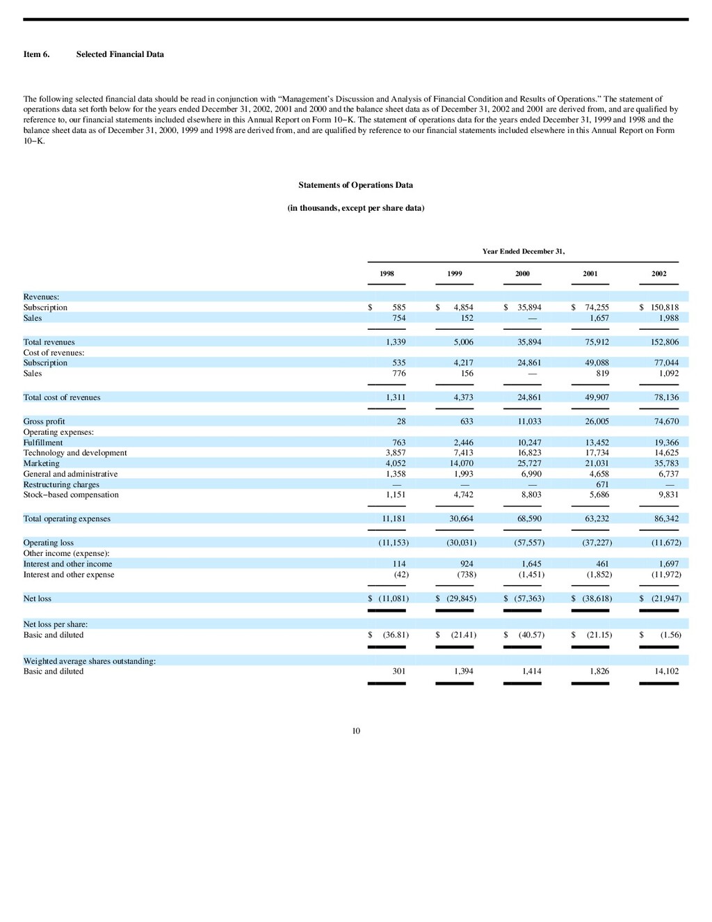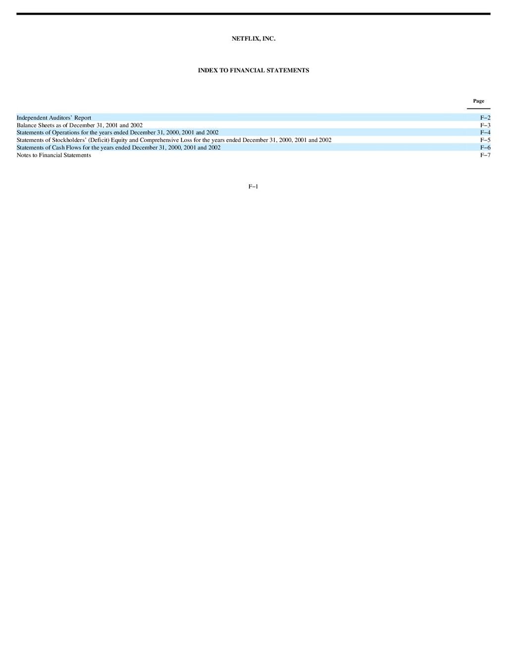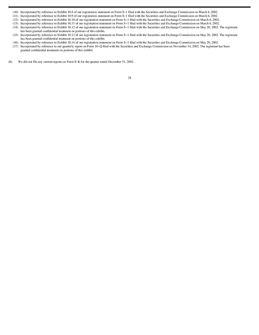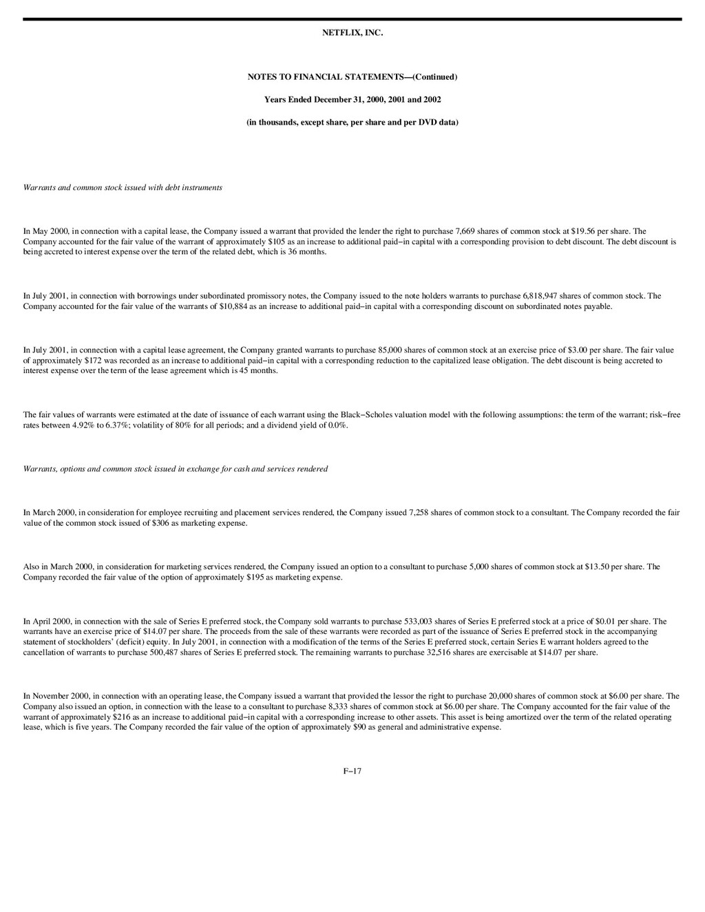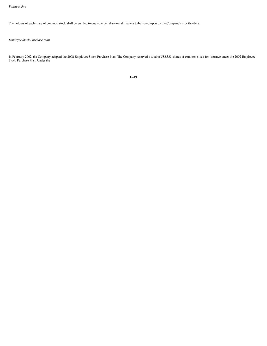 (in thousands, except share data) Convertible Preferred Stock Common Stock Additional Paid−in Capital Deferred Stock− Based Compen− sation Accumulated Other Compre− hensive Income Compre− hensive Loss Accum− ulated Deficit Total Stock− holders' (Deficit) Equity Shares Amount Shares Amount Balances as of January 1, 2000 4,444,545 $ 4 2,074,160 $ 2 $ 16,092 $ (6,841) $ — $ (41,285) $ (32,028) Exercise of options and issuance of restricted stock — — 81,003 — 422 — — — 422 Repurchase of restricted stock — — (26,653) — (141) — — — (141) Issuance of common stock in exchange for services rendered — — 7,258 — 306 — — — 306 Warrants issued in connection with operating lease — — — — 216 — — — 216 Warrants issued in connection with services rendered — — — — 285 — — — 285 Warrants issued in connection with debt financing — — — — 105 — — — 105 Subscribed Series F non−voting preferred stock — — — — 6,128 — — — 6,128 Deferred stock−based compensation, net — — — — 11,228 (11,228) — — — Stock−based compensation expense — — — — — 8,803 — — 8,803 Net loss — — — — — — — $ (57,363) (57,363) (57,363) Appreciation (depreciation) in value of available−for−sale securities — — — — — — — — — — Comprehensive loss — — — — — — — $ (57,363) — — Balances as of December 31, 2000 4,444,545 4 2,135,768 2 34,641 (9,266) — (98,648) (73,267) Exercise of options — — 30,046 — 125 — — — 125 Repurchase of restricted stock — — (5,625) — (12) — — — (12) Issuance of common stock in exchange for services rendered — — 1,666 — 10 — — — 10 Warrants issued in connection with subordinated notes payable — — — — 10,884 — — — 10,884 Warrants issued in connection with capital lease obligation — — — — 172 — — — 172 Warrants issued in exchange for services rendered — — — — 18 — — — 18 Issuance of Series F non−voting preferred stock 1,712,954 2 — — 4,279 — — — 4,281 Subscribed Series F non−voting preferred stock — — — — 217 — — — 217 Deferred stock−based compensation, net — — — — 2,145 (2,145) — — — Stock−based compensation expense — — — — — 5,686 — — 5,686 Net loss — — — — — — — $ (38,618) (38,618) (38,618) Appreciation (depreciation) in value of available−for−sale securities — — — — — — — — — — Comprehensive loss — — — — — — — $ (38,618) — — Balances as of December 31, 2001 6,157,499 6 2,161,855 2 52,479 (5,725) — (137,266) (90,504) Exercise of options — — 438,838 — 1,287 — — — 1,287 Issuance of common stock under Employee Stock Purchase Plan — — 47,746 — 363 — — — 363 Repurchase of restricted stock — — (1,729) — (6) — — — (6) Issuance of Series F non−voting preferred stock 3,492,737 4 — — 1,314 — — — 1,318 Issuance of common stock, net of costs — — 6,328,084 6 86,208 — — — 86,214 Conversion of preferred stock into common stock (9,650,236) (10) 3,216,740 3 7 — — — — Conversion of redeemable convertible preferred stock into common stock — — 9,659,700 10 101,820 — — — 101,830 Issuance of common stock upon exercise of warrants — — 594,561 1 195 — — — 196 Deferred stock−based compensation, net — — — — 15,505 (15,505) — — — Stock−based compensation expense — — — — — 9,831 — — 9,831 Net loss — — — — — — — $ (21,947) (21,947) (21,947) Appreciation (depreciation) in value of available−for−sale securities — — — — — — 774 774 — 774 Comprehensive loss — — — — — — — $ (21,173) — — Balances as of December 31, 2002 — $ — 22,445,795 $ 22 $ 259,172 $ (11,399) $ 774 $ (159,213) $ 89,356 See accompanying notes to financial statements. F−5