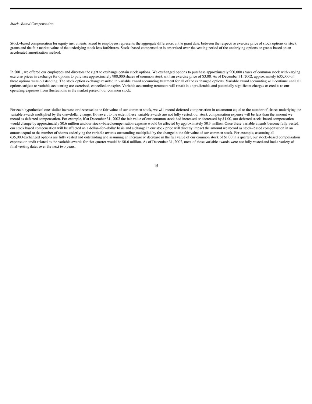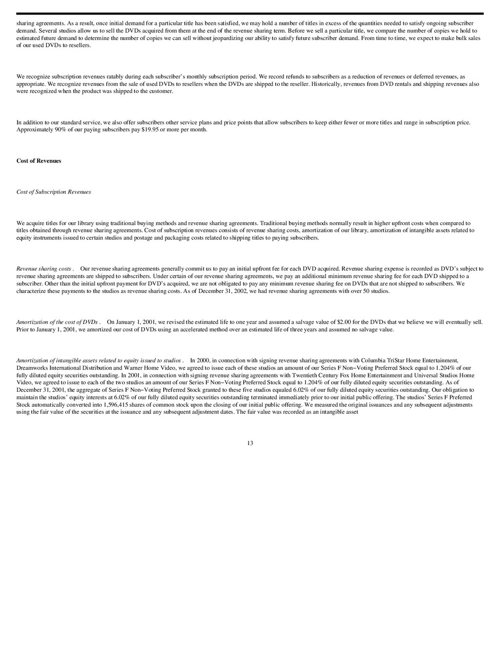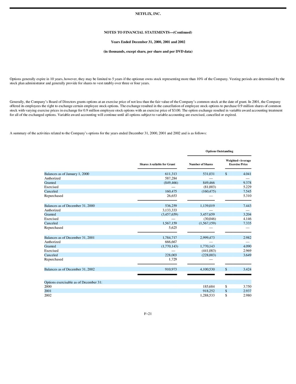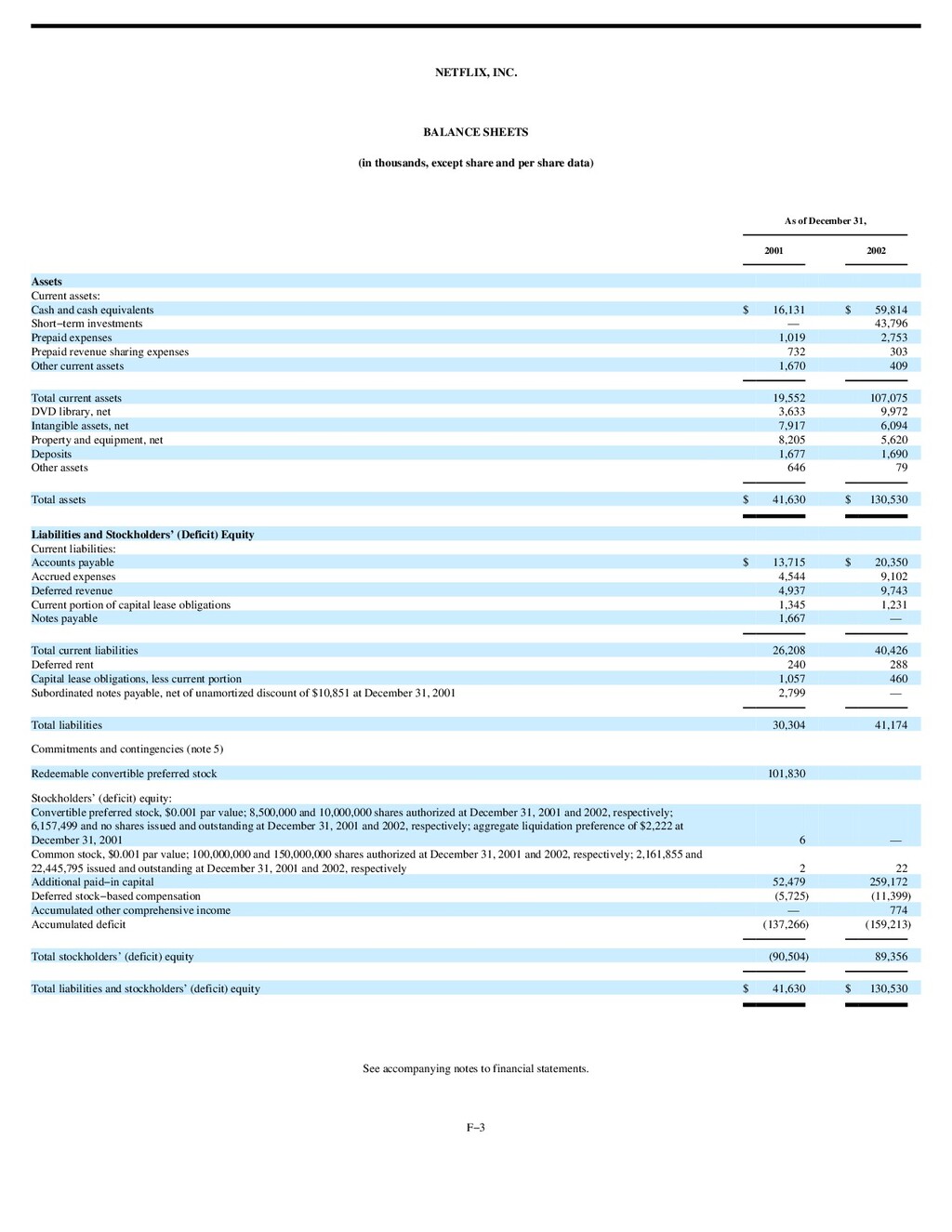 (in thousands, except share data) Convertible Preferred Stock Common Stock Additional Paid−in Capital Deferred Stock− Based Compen− sation Accumulated Other Compre− hensive Income Compre− hensive Loss Accum− ulated Deficit Total Stock− holders' (Deficit) Equity Shares Amount Shares Amount Balances as of January 1, 2000 4,444,545 $ 4 2,074,160 $ 2 $ 16,092 $ (6,841) $ — $ (41,285) $ (32,028) Exercise of options and issuance of restricted stock — — 81,003 — 422 — — — 422 Repurchase of restricted stock — — (26,653) — (141) — — — (141) Issuance of common stock in exchange for services rendered — — 7,258 — 306 — — — 306 Warrants issued in connection with operating lease — — — — 216 — — — 216 Warrants issued in connection with services rendered — — — — 285 — — — 285 Warrants issued in connection with debt financing — — — — 105 — — — 105 Subscribed Series F non−voting preferred stock — — — — 6,128 — — — 6,128 Deferred stock−based compensation, net — — — — 11,228 (11,228) — — — Stock−based compensation expense — — — — — 8,803 — — 8,803 Net loss — — — — — — — $ (57,363) (57,363) (57,363) Appreciation (depreciation) in value of available−for−sale securities — — — — — — — — — — Comprehensive loss — — — — — — — $ (57,363) — — Balances as of December 31, 2000 4,444,545 4 2,135,768 2 34,641 (9,266) — (98,648) (73,267) Exercise of options — — 30,046 — 125 — — — 125 Repurchase of restricted stock — — (5,625) — (12) — — — (12) Issuance of common stock in exchange for services rendered — — 1,666 — 10 — — — 10 Warrants issued in connection with subordinated notes payable — — — — 10,884 — — — 10,884 Warrants issued in connection with capital lease obligation — — — — 172 — — — 172 Warrants issued in exchange for services rendered — — — — 18 — — — 18 Issuance of Series F non−voting preferred stock 1,712,954 2 — — 4,279 — — — 4,281 Subscribed Series F non−voting preferred stock — — — — 217 — — — 217 Deferred stock−based compensation, net — — — — 2,145 (2,145) — — — Stock−based compensation expense — — — — — 5,686 — — 5,686 Net loss — — — — — — — $ (38,618) (38,618) (38,618) Appreciation (depreciation) in value of available−for−sale securities — — — — — — — — — — Comprehensive loss — — — — — — — $ (38,618) — — Balances as of December 31, 2001 6,157,499 6 2,161,855 2 52,479 (5,725) — (137,266) (90,504) Exercise of options — — 438,838 — 1,287 — — — 1,287 Issuance of common stock under Employee Stock Purchase Plan — — 47,746 — 363 — — — 363 Repurchase of restricted stock — — (1,729) — (6) — — — (6) Issuance of Series F non−voting preferred stock 3,492,737 4 — — 1,314 — — — 1,318 Issuance of common stock, net of costs — — 6,328,084 6 86,208 — — — 86,214 Conversion of preferred stock into common stock (9,650,236) (10) 3,216,740 3 7 — — — — Conversion of redeemable convertible preferred stock into common stock — — 9,659,700 10 101,820 — — — 101,830 Issuance of common stock upon exercise of warrants — — 594,561 1 195 — — — 196 Deferred stock−based compensation, net — — — — 15,505 (15,505) — — — Stock−based compensation expense — — — — — 9,831 — — 9,831 Net loss — — — — — — — $ (21,947) (21,947) (21,947) Appreciation (depreciation) in value of available−for−sale securities — — — — — — 774 774 — 774 Comprehensive loss — — — — — — — $ (21,173) — — Balances as of December 31, 2002 — $ — 22,445,795 $ 22 $ 259,172 $ (11,399) $ 774 $ (159,213) $ 89,356 See accompanying notes to financial statements. F−5