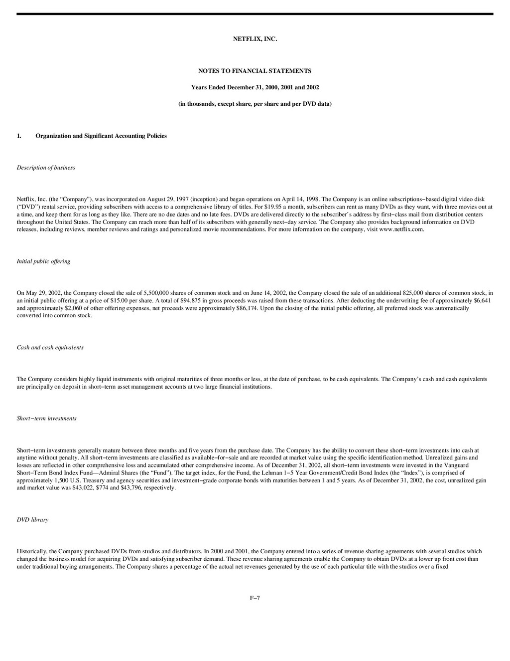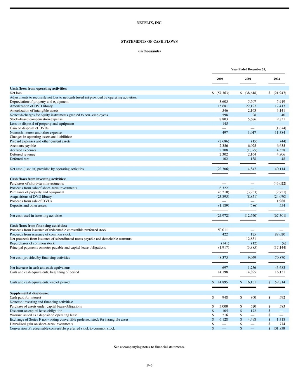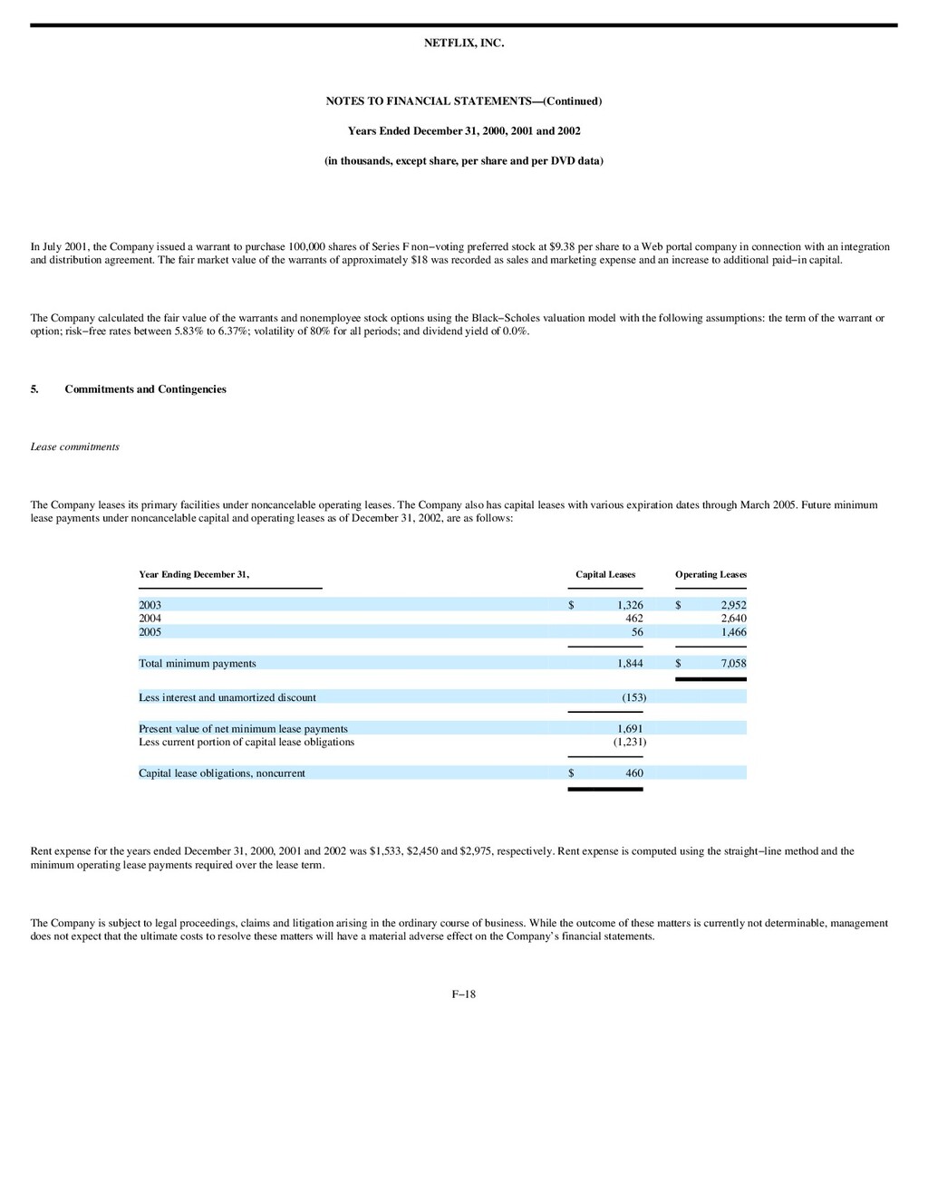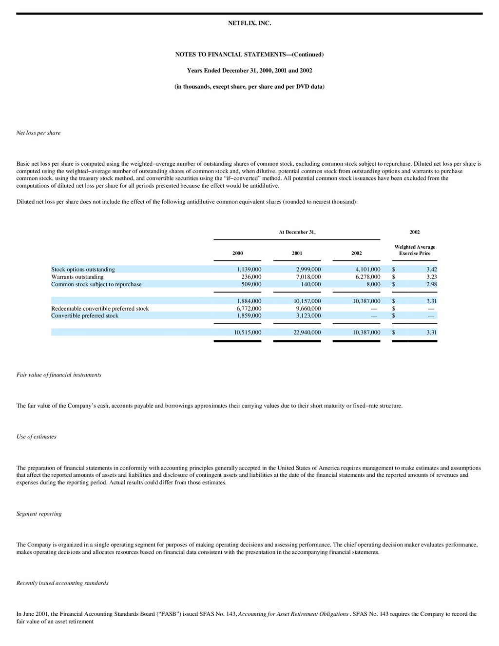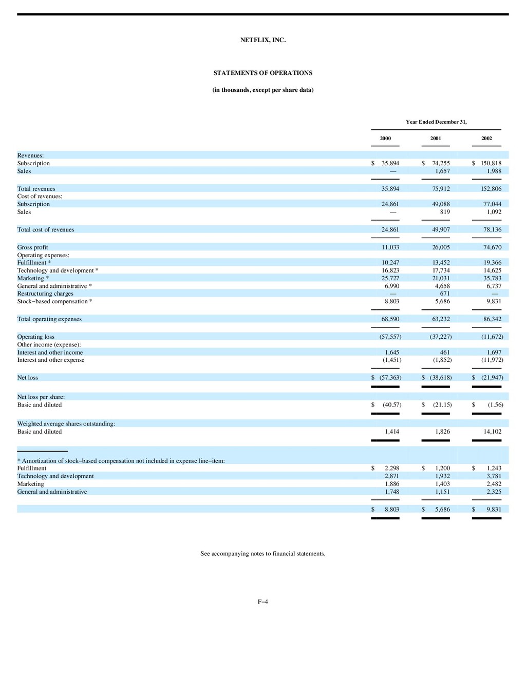 (in thousands, except share data) Convertible Preferred Stock Common Stock Additional Paid−in Capital Deferred Stock− Based Compen− sation Accumulated Other Compre− hensive Income Compre− hensive Loss Accum− ulated Deficit Total Stock− holders' (Deficit) Equity Shares Amount Shares Amount Balances as of January 1, 2000 4,444,545 $ 4 2,074,160 $ 2 $ 16,092 $ (6,841) $ — $ (41,285) $ (32,028) Exercise of options and issuance of restricted stock — — 81,003 — 422 — — — 422 Repurchase of restricted stock — — (26,653) — (141) — — — (141) Issuance of common stock in exchange for services rendered — — 7,258 — 306 — — — 306 Warrants issued in connection with operating lease — — — — 216 — — — 216 Warrants issued in connection with services rendered — — — — 285 — — — 285 Warrants issued in connection with debt financing — — — — 105 — — — 105 Subscribed Series F non−voting preferred stock — — — — 6,128 — — — 6,128 Deferred stock−based compensation, net — — — — 11,228 (11,228) — — — Stock−based compensation expense — — — — — 8,803 — — 8,803 Net loss — — — — — — — $ (57,363) (57,363) (57,363) Appreciation (depreciation) in value of available−for−sale securities — — — — — — — — — — Comprehensive loss — — — — — — — $ (57,363) — — Balances as of December 31, 2000 4,444,545 4 2,135,768 2 34,641 (9,266) — (98,648) (73,267) Exercise of options — — 30,046 — 125 — — — 125 Repurchase of restricted stock — — (5,625) — (12) — — — (12) Issuance of common stock in exchange for services rendered — — 1,666 — 10 — — — 10 Warrants issued in connection with subordinated notes payable — — — — 10,884 — — — 10,884 Warrants issued in connection with capital lease obligation — — — — 172 — — — 172 Warrants issued in exchange for services rendered — — — — 18 — — — 18 Issuance of Series F non−voting preferred stock 1,712,954 2 — — 4,279 — — — 4,281 Subscribed Series F non−voting preferred stock — — — — 217 — — — 217 Deferred stock−based compensation, net — — — — 2,145 (2,145) — — — Stock−based compensation expense — — — — — 5,686 — — 5,686 Net loss — — — — — — — $ (38,618) (38,618) (38,618) Appreciation (depreciation) in value of available−for−sale securities — — — — — — — — — — Comprehensive loss — — — — — — — $ (38,618) — — Balances as of December 31, 2001 6,157,499 6 2,161,855 2 52,479 (5,725) — (137,266) (90,504) Exercise of options — — 438,838 — 1,287 — — — 1,287 Issuance of common stock under Employee Stock Purchase Plan — — 47,746 — 363 — — — 363 Repurchase of restricted stock — — (1,729) — (6) — — — (6) Issuance of Series F non−voting preferred stock 3,492,737 4 — — 1,314 — — — 1,318 Issuance of common stock, net of costs — — 6,328,084 6 86,208 — — — 86,214 Conversion of preferred stock into common stock (9,650,236) (10) 3,216,740 3 7 — — — — Conversion of redeemable convertible preferred stock into common stock — — 9,659,700 10 101,820 — — — 101,830 Issuance of common stock upon exercise of warrants — — 594,561 1 195 — — — 196 Deferred stock−based compensation, net — — — — 15,505 (15,505) — — — Stock−based compensation expense — — — — — 9,831 — — 9,831 Net loss — — — — — — — $ (21,947) (21,947) (21,947) Appreciation (depreciation) in value of available−for−sale securities — — — — — — 774 774 — 774 Comprehensive loss — — — — — — — $ (21,173) — — Balances as of December 31, 2002 — $ — 22,445,795 $ 22 $ 259,172 $ (11,399) $ 774 $ (159,213) $ 89,356 See accompanying notes to financial statements. F−5