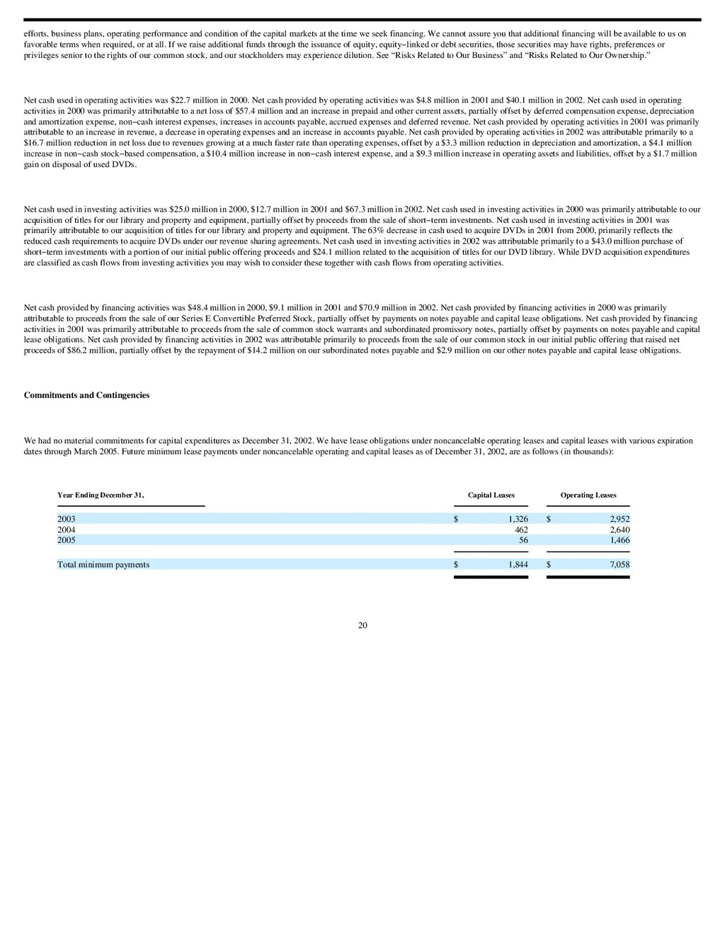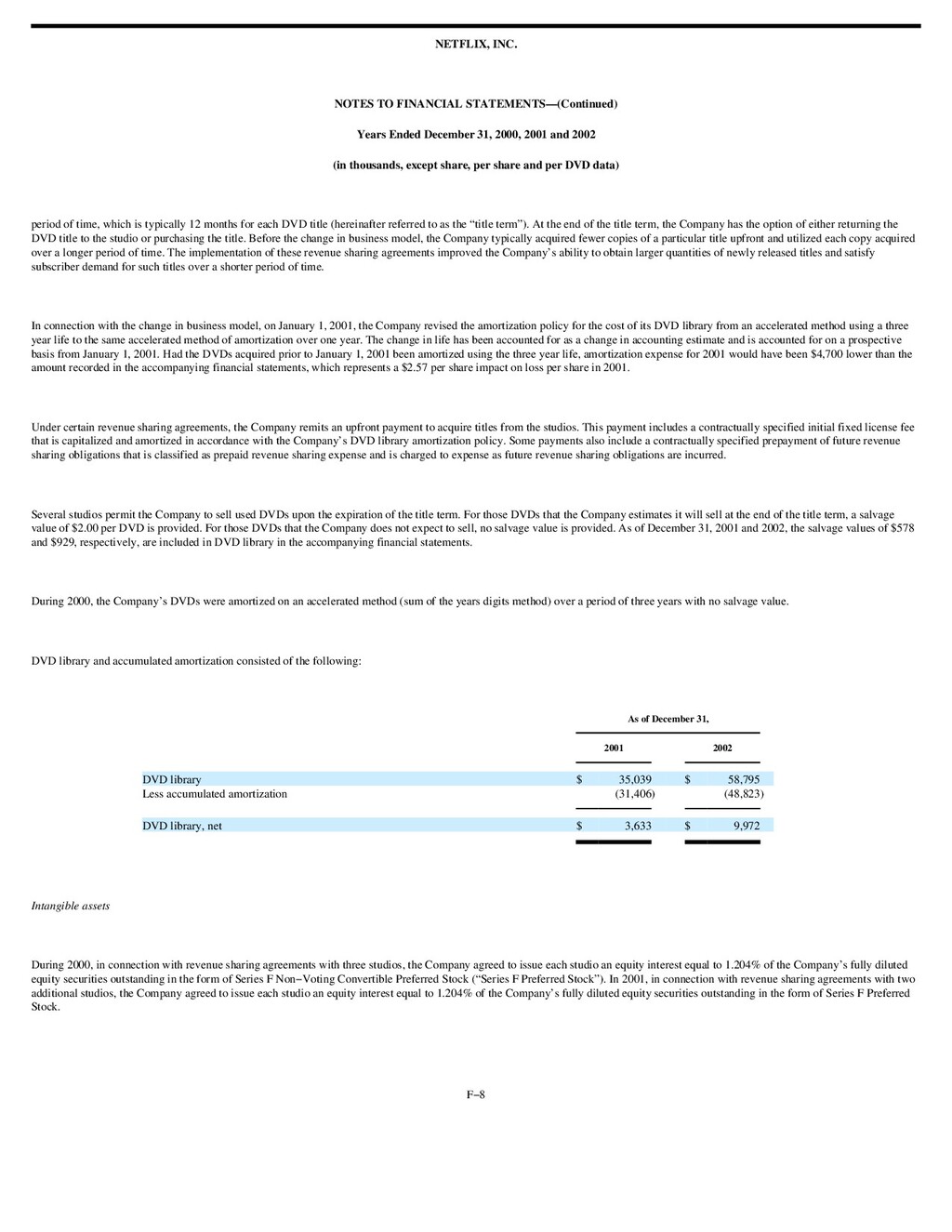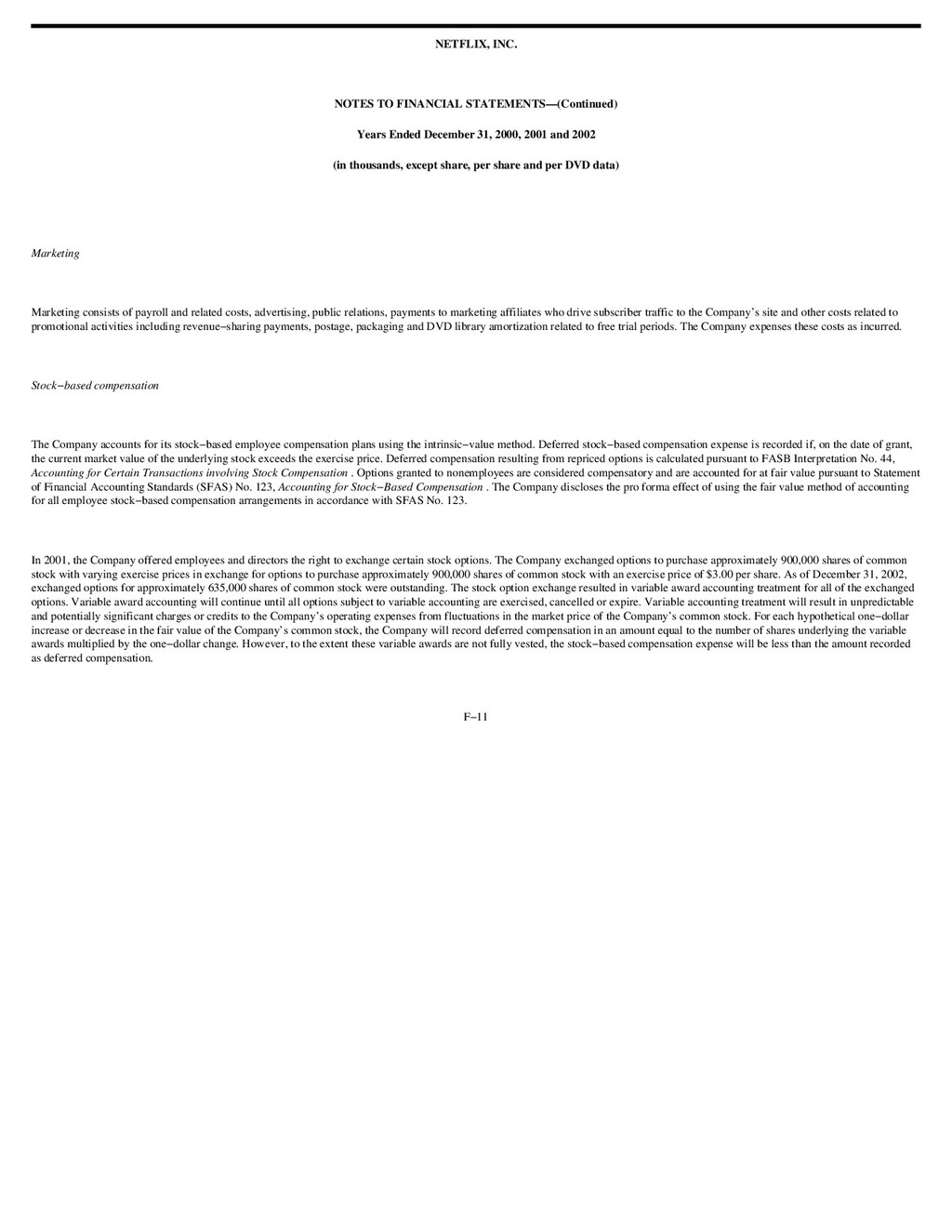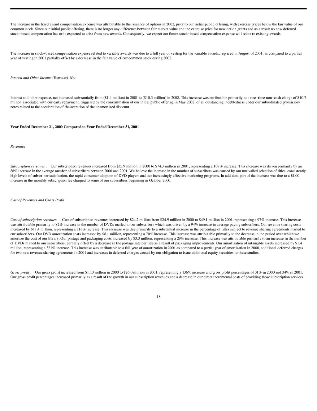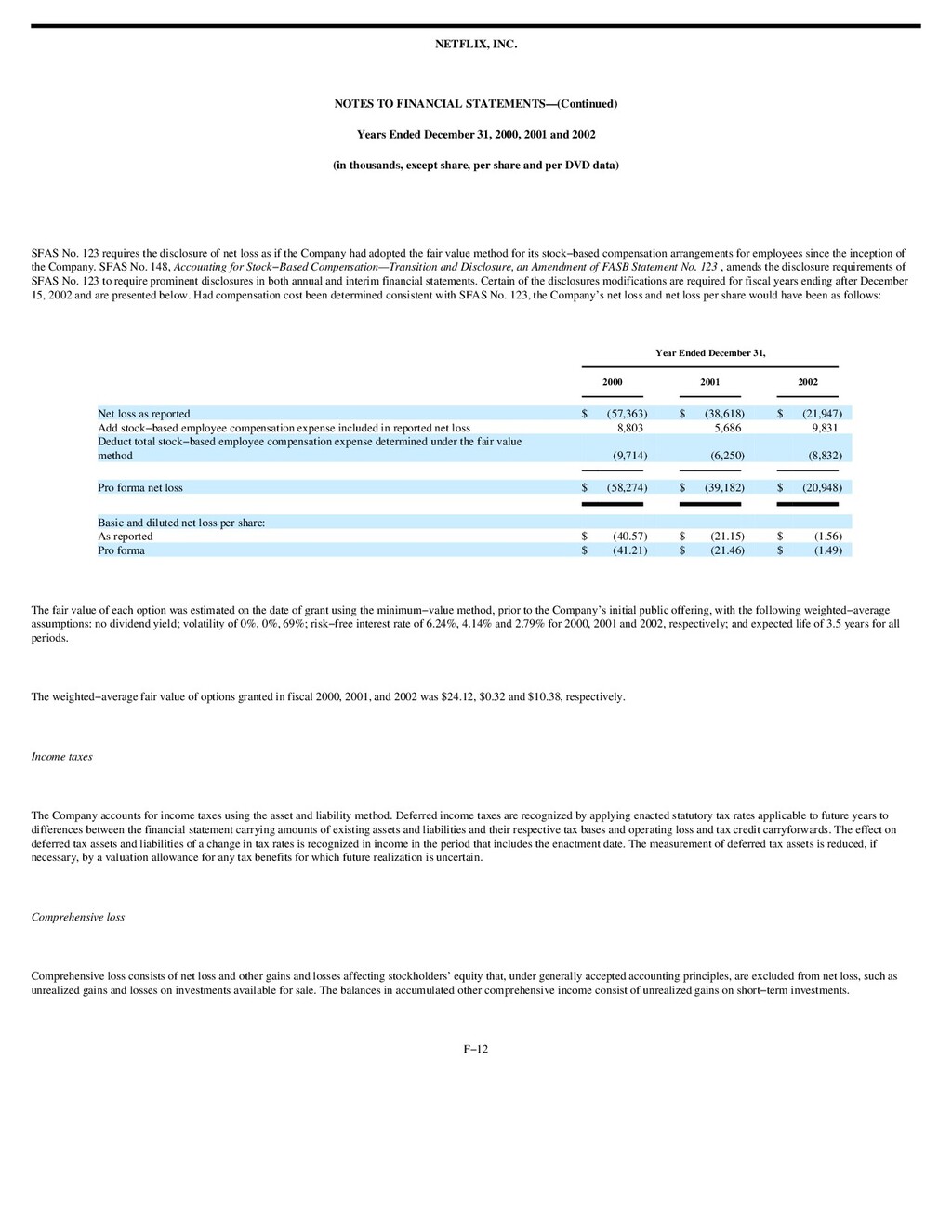 (in thousands, except share data) Convertible Preferred Stock Common Stock Additional Paid−in Capital Deferred Stock− Based Compen− sation Accumulated Other Compre− hensive Income Compre− hensive Loss Accum− ulated Deficit Total Stock− holders' (Deficit) Equity Shares Amount Shares Amount Balances as of January 1, 2000 4,444,545 $ 4 2,074,160 $ 2 $ 16,092 $ (6,841) $ — $ (41,285) $ (32,028) Exercise of options and issuance of restricted stock — — 81,003 — 422 — — — 422 Repurchase of restricted stock — — (26,653) — (141) — — — (141) Issuance of common stock in exchange for services rendered — — 7,258 — 306 — — — 306 Warrants issued in connection with operating lease — — — — 216 — — — 216 Warrants issued in connection with services rendered — — — — 285 — — — 285 Warrants issued in connection with debt financing — — — — 105 — — — 105 Subscribed Series F non−voting preferred stock — — — — 6,128 — — — 6,128 Deferred stock−based compensation, net — — — — 11,228 (11,228) — — — Stock−based compensation expense — — — — — 8,803 — — 8,803 Net loss — — — — — — — $ (57,363) (57,363) (57,363) Appreciation (depreciation) in value of available−for−sale securities — — — — — — — — — — Comprehensive loss — — — — — — — $ (57,363) — — Balances as of December 31, 2000 4,444,545 4 2,135,768 2 34,641 (9,266) — (98,648) (73,267) Exercise of options — — 30,046 — 125 — — — 125 Repurchase of restricted stock — — (5,625) — (12) — — — (12) Issuance of common stock in exchange for services rendered — — 1,666 — 10 — — — 10 Warrants issued in connection with subordinated notes payable — — — — 10,884 — — — 10,884 Warrants issued in connection with capital lease obligation — — — — 172 — — — 172 Warrants issued in exchange for services rendered — — — — 18 — — — 18 Issuance of Series F non−voting preferred stock 1,712,954 2 — — 4,279 — — — 4,281 Subscribed Series F non−voting preferred stock — — — — 217 — — — 217 Deferred stock−based compensation, net — — — — 2,145 (2,145) — — — Stock−based compensation expense — — — — — 5,686 — — 5,686 Net loss — — — — — — — $ (38,618) (38,618) (38,618) Appreciation (depreciation) in value of available−for−sale securities — — — — — — — — — — Comprehensive loss — — — — — — — $ (38,618) — — Balances as of December 31, 2001 6,157,499 6 2,161,855 2 52,479 (5,725) — (137,266) (90,504) Exercise of options — — 438,838 — 1,287 — — — 1,287 Issuance of common stock under Employee Stock Purchase Plan — — 47,746 — 363 — — — 363 Repurchase of restricted stock — — (1,729) — (6) — — — (6) Issuance of Series F non−voting preferred stock 3,492,737 4 — — 1,314 — — — 1,318 Issuance of common stock, net of costs — — 6,328,084 6 86,208 — — — 86,214 Conversion of preferred stock into common stock (9,650,236) (10) 3,216,740 3 7 — — — — Conversion of redeemable convertible preferred stock into common stock — — 9,659,700 10 101,820 — — — 101,830 Issuance of common stock upon exercise of warrants — — 594,561 1 195 — — — 196 Deferred stock−based compensation, net — — — — 15,505 (15,505) — — — Stock−based compensation expense — — — — — 9,831 — — 9,831 Net loss — — — — — — — $ (21,947) (21,947) (21,947) Appreciation (depreciation) in value of available−for−sale securities — — — — — — 774 774 — 774 Comprehensive loss — — — — — — — $ (21,173) — — Balances as of December 31, 2002 — $ — 22,445,795 $ 22 $ 259,172 $ (11,399) $ 774 $ (159,213) $ 89,356 See accompanying notes to financial statements. F−5