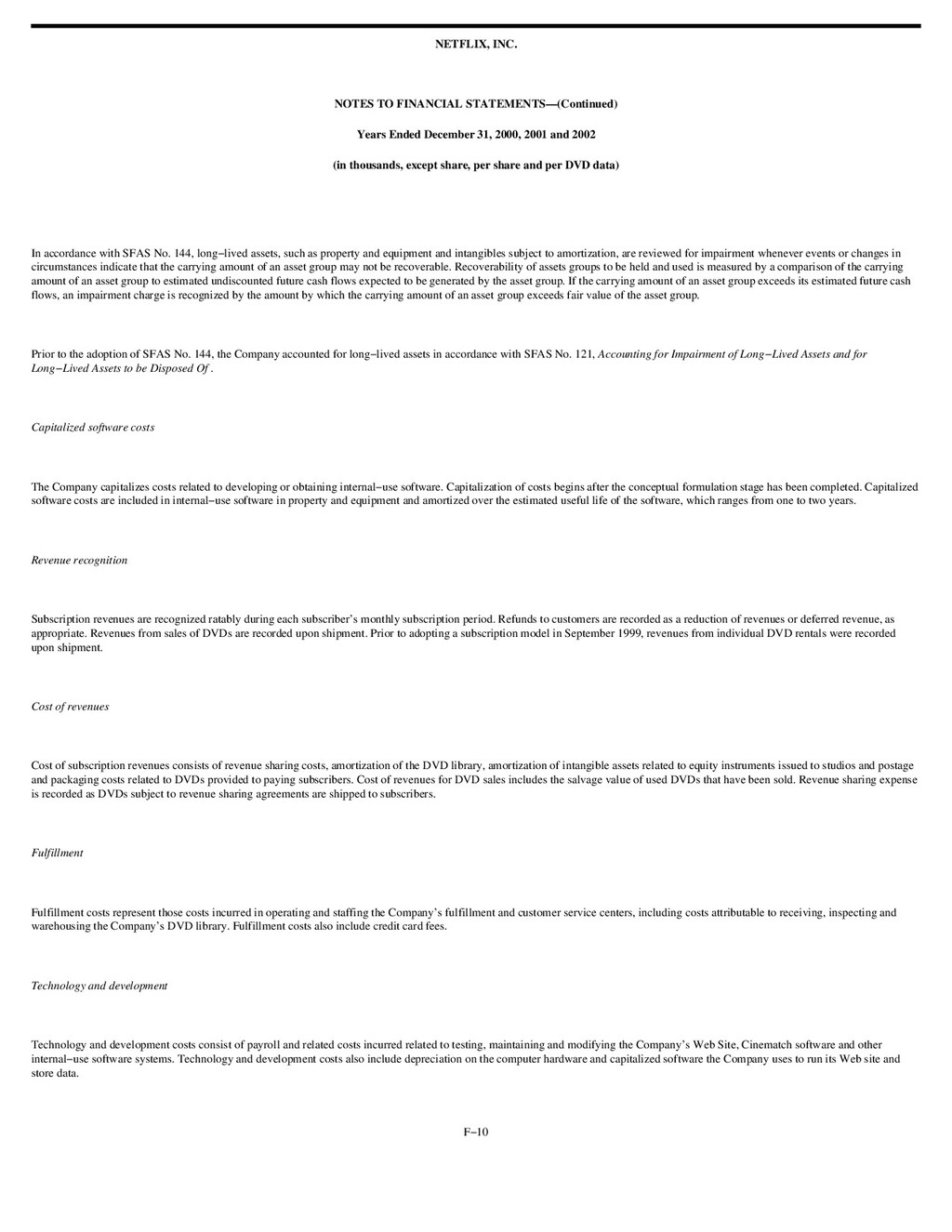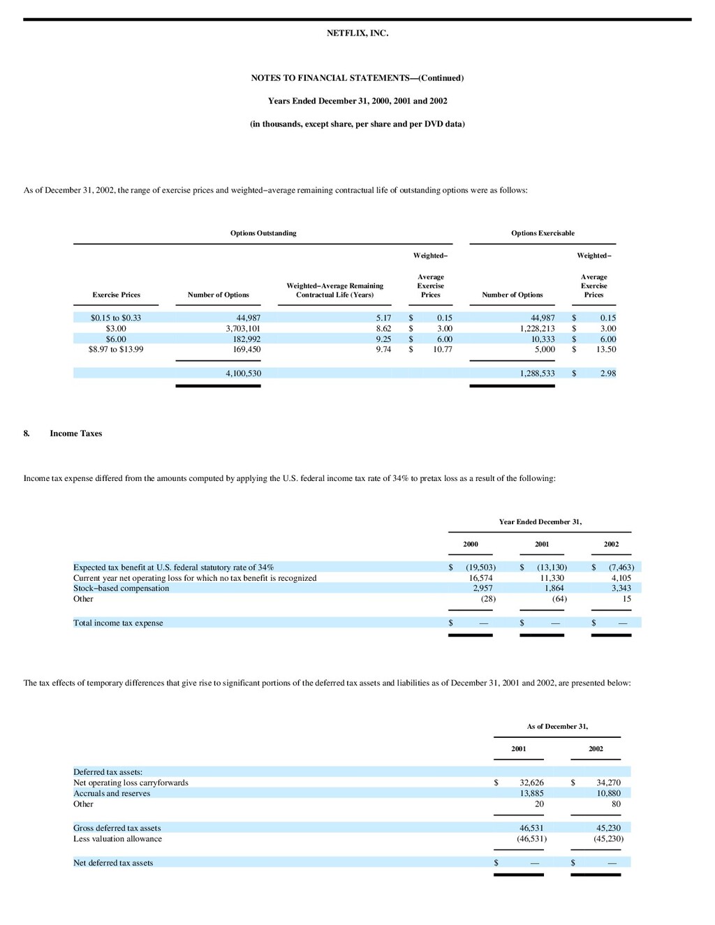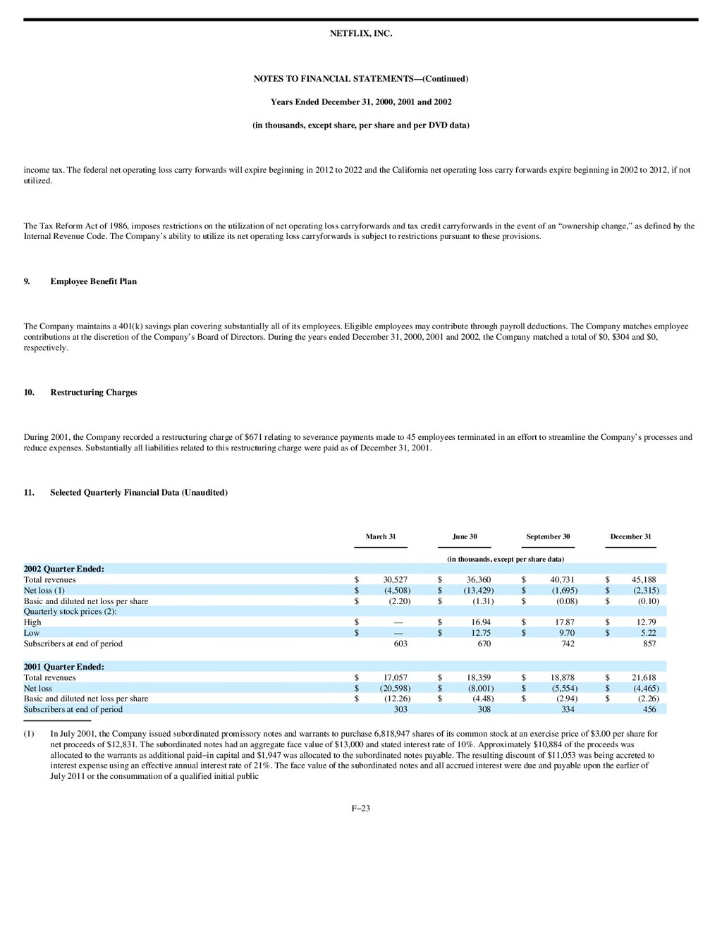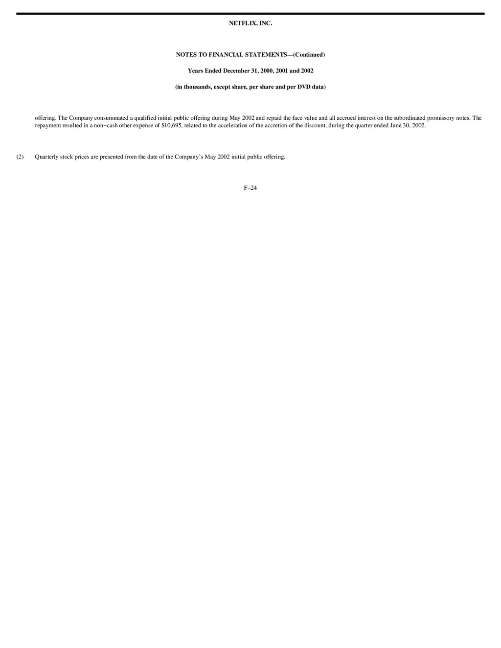 (in thousands, except share data) Convertible Preferred Stock Common Stock Additional Paid−in Capital Deferred Stock− Based Compen− sation Accumulated Other Compre− hensive Income Compre− hensive Loss Accum− ulated Deficit Total Stock− holders' (Deficit) Equity Shares Amount Shares Amount Balances as of January 1, 2000 4,444,545 $ 4 2,074,160 $ 2 $ 16,092 $ (6,841) $ — $ (41,285) $ (32,028) Exercise of options and issuance of restricted stock — — 81,003 — 422 — — — 422 Repurchase of restricted stock — — (26,653) — (141) — — — (141) Issuance of common stock in exchange for services rendered — — 7,258 — 306 — — — 306 Warrants issued in connection with operating lease — — — — 216 — — — 216 Warrants issued in connection with services rendered — — — — 285 — — — 285 Warrants issued in connection with debt financing — — — — 105 — — — 105 Subscribed Series F non−voting preferred stock — — — — 6,128 — — — 6,128 Deferred stock−based compensation, net — — — — 11,228 (11,228) — — — Stock−based compensation expense — — — — — 8,803 — — 8,803 Net loss — — — — — — — $ (57,363) (57,363) (57,363) Appreciation (depreciation) in value of available−for−sale securities — — — — — — — — — — Comprehensive loss — — — — — — — $ (57,363) — — Balances as of December 31, 2000 4,444,545 4 2,135,768 2 34,641 (9,266) — (98,648) (73,267) Exercise of options — — 30,046 — 125 — — — 125 Repurchase of restricted stock — — (5,625) — (12) — — — (12) Issuance of common stock in exchange for services rendered — — 1,666 — 10 — — — 10 Warrants issued in connection with subordinated notes payable — — — — 10,884 — — — 10,884 Warrants issued in connection with capital lease obligation — — — — 172 — — — 172 Warrants issued in exchange for services rendered — — — — 18 — — — 18 Issuance of Series F non−voting preferred stock 1,712,954 2 — — 4,279 — — — 4,281 Subscribed Series F non−voting preferred stock — — — — 217 — — — 217 Deferred stock−based compensation, net — — — — 2,145 (2,145) — — — Stock−based compensation expense — — — — — 5,686 — — 5,686 Net loss — — — — — — — $ (38,618) (38,618) (38,618) Appreciation (depreciation) in value of available−for−sale securities — — — — — — — — — — Comprehensive loss — — — — — — — $ (38,618) — — Balances as of December 31, 2001 6,157,499 6 2,161,855 2 52,479 (5,725) — (137,266) (90,504) Exercise of options — — 438,838 — 1,287 — — — 1,287 Issuance of common stock under Employee Stock Purchase Plan — — 47,746 — 363 — — — 363 Repurchase of restricted stock — — (1,729) — (6) — — — (6) Issuance of Series F non−voting preferred stock 3,492,737 4 — — 1,314 — — — 1,318 Issuance of common stock, net of costs — — 6,328,084 6 86,208 — — — 86,214 Conversion of preferred stock into common stock (9,650,236) (10) 3,216,740 3 7 — — — — Conversion of redeemable convertible preferred stock into common stock — — 9,659,700 10 101,820 — — — 101,830 Issuance of common stock upon exercise of warrants — — 594,561 1 195 — — — 196 Deferred stock−based compensation, net — — — — 15,505 (15,505) — — — Stock−based compensation expense — — — — — 9,831 — — 9,831 Net loss — — — — — — — $ (21,947) (21,947) (21,947) Appreciation (depreciation) in value of available−for−sale securities — — — — — — 774 774 — 774 Comprehensive loss — — — — — — — $ (21,173) — — Balances as of December 31, 2002 — $ — 22,445,795 $ 22 $ 259,172 $ (11,399) $ 774 $ (159,213) $ 89,356 See accompanying notes to financial statements. F−5