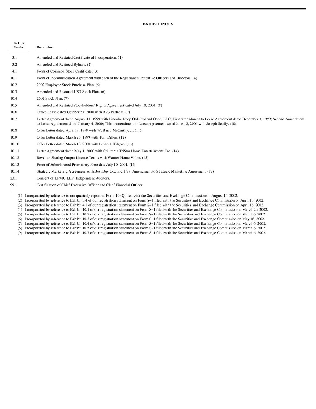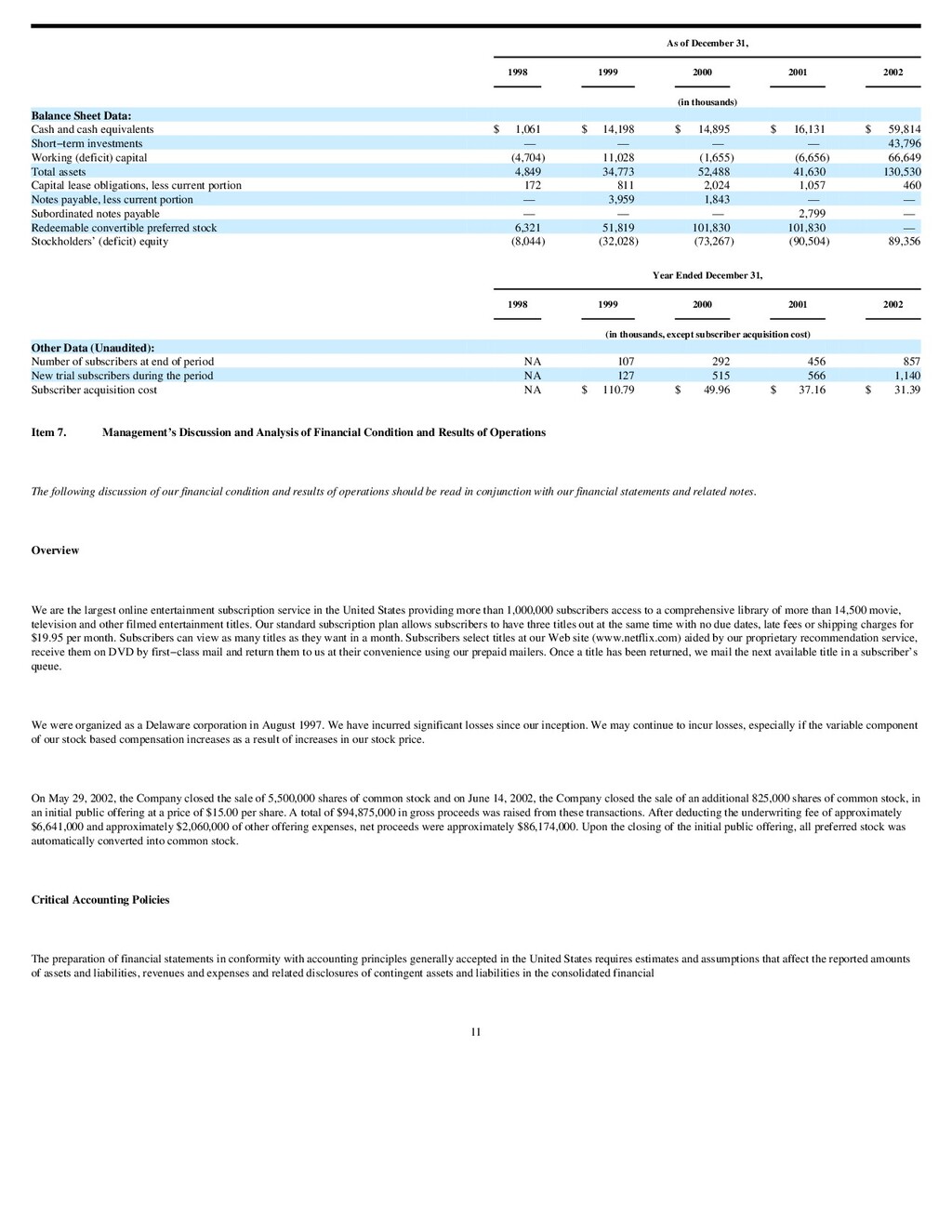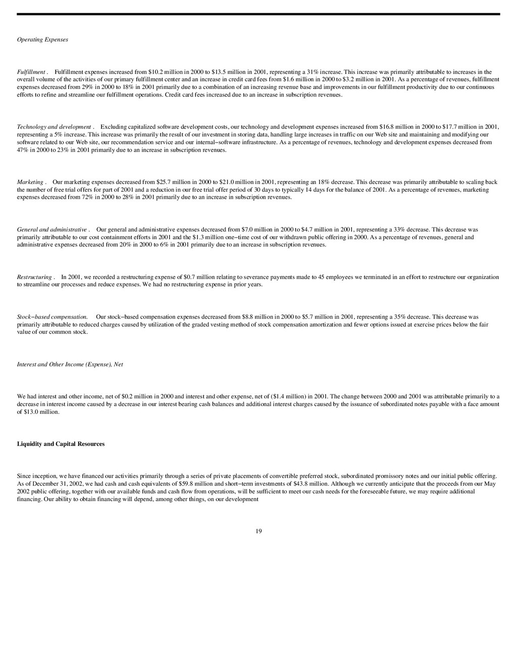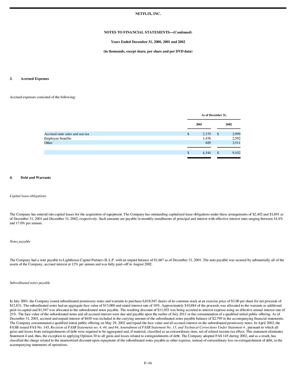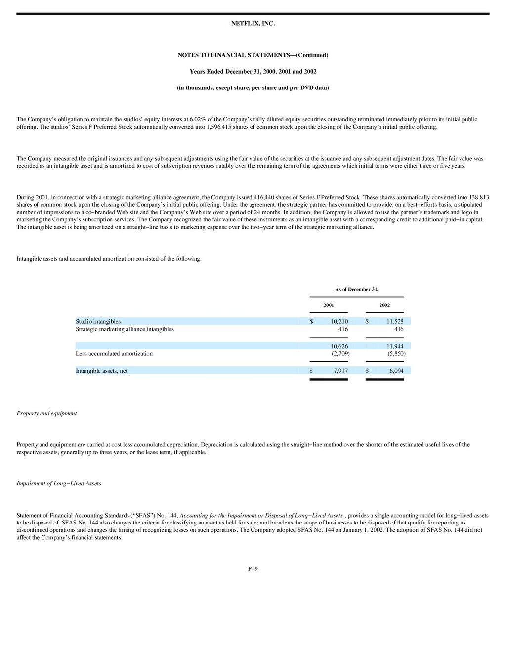(in thousands, except share data) Convertible Preferred Stock Common Stock Additional Paid−in Capital Deferred Stock− Based Compen− sation Accumulated Other Compre− hensive Income Compre− hensive Loss Accum− ulated Deficit Total Stock− holders' (Deficit) Equity Shares Amount Shares Amount Balances as of January 1, 2000 4,444,545 $ 4 2,074,160 $ 2 $ 16,092 $ (6,841) $ — $ (41,285) $ (32,028) Exercise of options and issuance of restricted stock — — 81,003 — 422 — — — 422 Repurchase of restricted stock — — (26,653) — (141) — — — (141) Issuance of common stock in exchange for services rendered — — 7,258 — 306 — — — 306 Warrants issued in connection with operating lease — — — — 216 — — — 216 Warrants issued in connection with services rendered — — — — 285 — — — 285 Warrants issued in connection with debt financing — — — — 105 — — — 105 Subscribed Series F non−voting preferred stock — — — — 6,128 — — — 6,128 Deferred stock−based compensation, net — — — — 11,228 (11,228) — — — Stock−based compensation expense — — — — — 8,803 — — 8,803 Net loss — — — — — — — $ (57,363) (57,363) (57,363) Appreciation (depreciation) in value of available−for−sale securities — — — — — — — — — — Comprehensive loss — — — — — — — $ (57,363) — — Balances as of December 31, 2000 4,444,545 4 2,135,768 2 34,641 (9,266) — (98,648) (73,267) Exercise of options — — 30,046 — 125 — — — 125 Repurchase of restricted stock — — (5,625) — (12) — — — (12) Issuance of common stock in exchange for services rendered — — 1,666 — 10 — — — 10 Warrants issued in connection with subordinated notes payable — — — — 10,884 — — — 10,884 Warrants issued in connection with capital lease obligation — — — — 172 — — — 172 Warrants issued in exchange for services rendered — — — — 18 — — — 18 Issuance of Series F non−voting preferred stock 1,712,954 2 — — 4,279 — — — 4,281 Subscribed Series F non−voting preferred stock — — — — 217 — — — 217 Deferred stock−based compensation, net — — — — 2,145 (2,145) — — — Stock−based compensation expense — — — — — 5,686 — — 5,686 Net loss — — — — — — — $ (38,618) (38,618) (38,618) Appreciation (depreciation) in value of available−for−sale securities — — — — — — — — — — Comprehensive loss — — — — — — — $ (38,618) — — Balances as of December 31, 2001 6,157,499 6 2,161,855 2 52,479 (5,725) — (137,266) (90,504) Exercise of options — — 438,838 — 1,287 — — — 1,287 Issuance of common stock under Employee Stock Purchase Plan — — 47,746 — 363 — — — 363 Repurchase of restricted stock — — (1,729) — (6) — — — (6) Issuance of Series F non−voting preferred stock 3,492,737 4 — — 1,314 — — — 1,318 Issuance of common stock, net of costs — — 6,328,084 6 86,208 — — — 86,214 Conversion of preferred stock into common stock (9,650,236) (10) 3,216,740 3 7 — — — — Conversion of redeemable convertible preferred stock into common stock — — 9,659,700 10 101,820 — — — 101,830 Issuance of common stock upon exercise of warrants — — 594,561 1 195 — — — 196 Deferred stock−based compensation, net — — — — 15,505 (15,505) — — — Stock−based compensation expense — — — — — 9,831 — — 9,831 Net loss — — — — — — — $ (21,947) (21,947) (21,947) Appreciation (depreciation) in value of available−for−sale securities — — — — — — 774 774 — 774 Comprehensive loss — — — — — — — $ (21,173) — — Balances as of December 31, 2002 — $ — 22,445,795 $ 22 $ 259,172 $ (11,399) $ 774 $ (159,213) $ 89,356 See accompanying notes to financial statements. F−5
