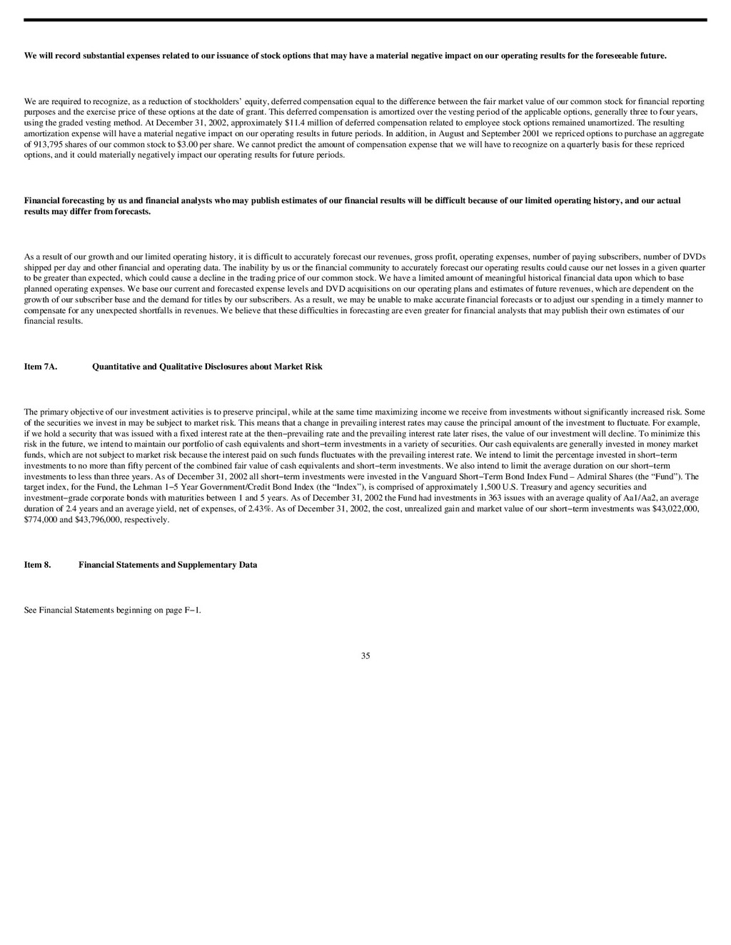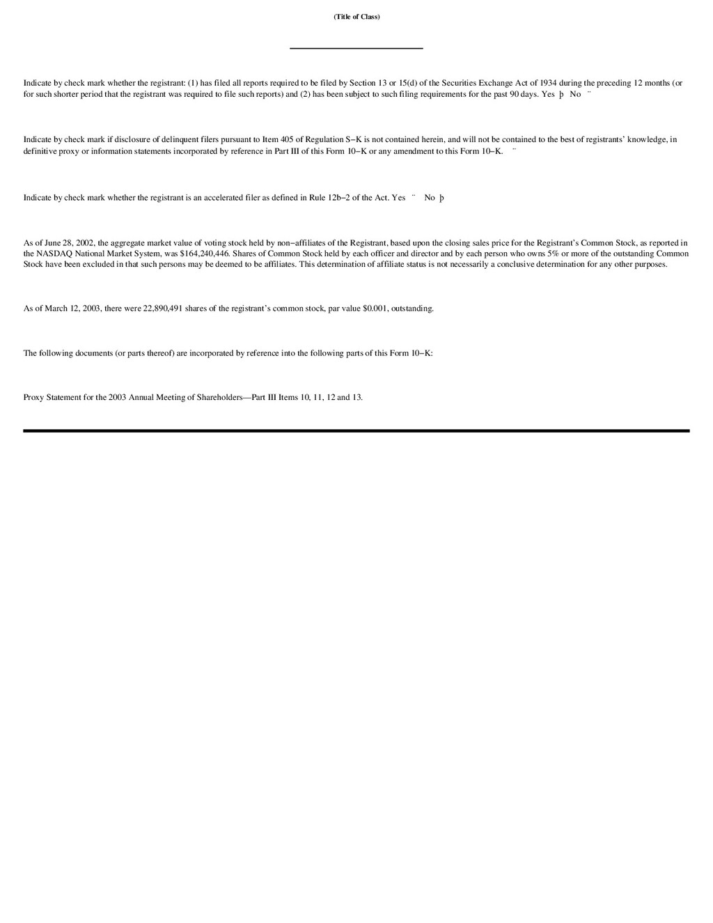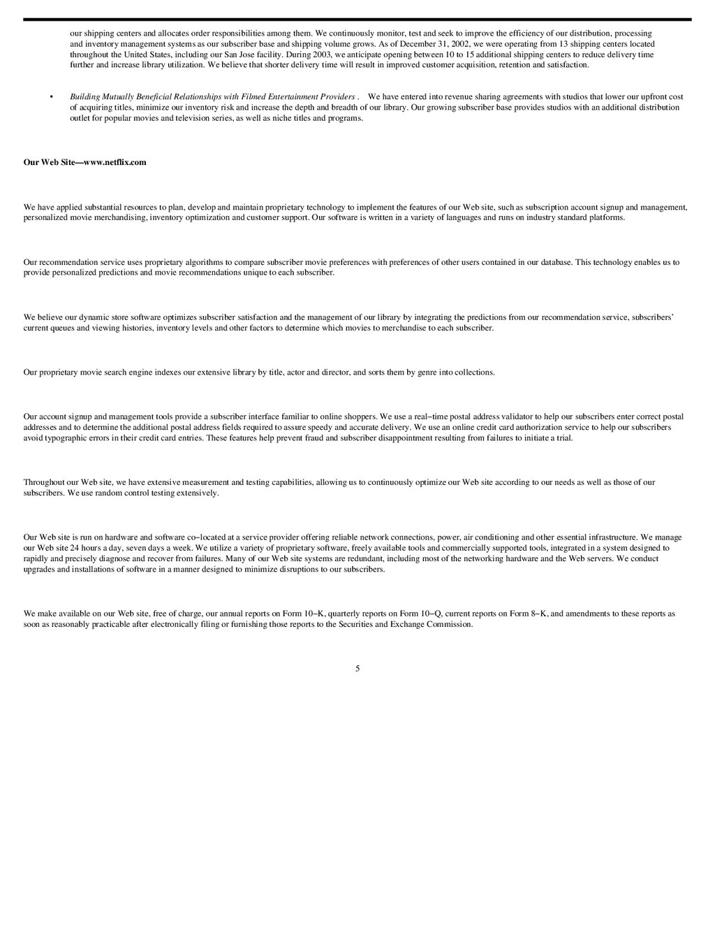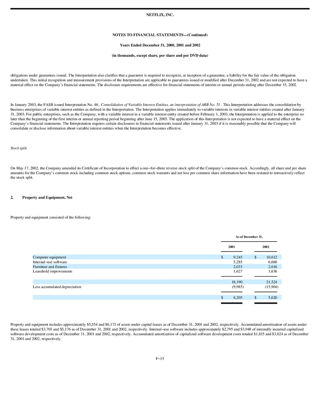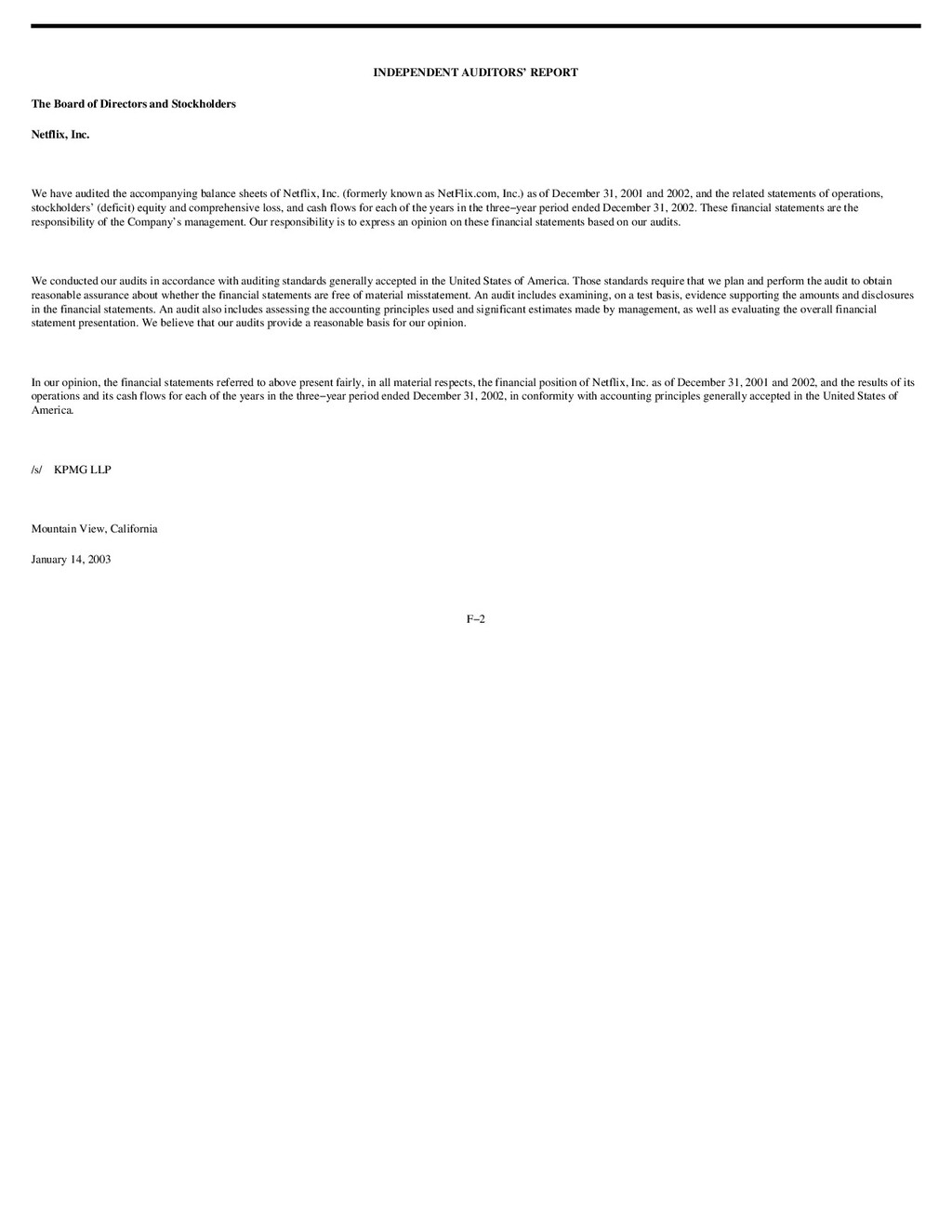 (in thousands, except share data) Convertible Preferred Stock Common Stock Additional Paid−in Capital Deferred Stock− Based Compen− sation Accumulated Other Compre− hensive Income Compre− hensive Loss Accum− ulated Deficit Total Stock− holders' (Deficit) Equity Shares Amount Shares Amount Balances as of January 1, 2000 4,444,545 $ 4 2,074,160 $ 2 $ 16,092 $ (6,841) $ — $ (41,285) $ (32,028) Exercise of options and issuance of restricted stock — — 81,003 — 422 — — — 422 Repurchase of restricted stock — — (26,653) — (141) — — — (141) Issuance of common stock in exchange for services rendered — — 7,258 — 306 — — — 306 Warrants issued in connection with operating lease — — — — 216 — — — 216 Warrants issued in connection with services rendered — — — — 285 — — — 285 Warrants issued in connection with debt financing — — — — 105 — — — 105 Subscribed Series F non−voting preferred stock — — — — 6,128 — — — 6,128 Deferred stock−based compensation, net — — — — 11,228 (11,228) — — — Stock−based compensation expense — — — — — 8,803 — — 8,803 Net loss — — — — — — — $ (57,363) (57,363) (57,363) Appreciation (depreciation) in value of available−for−sale securities — — — — — — — — — — Comprehensive loss — — — — — — — $ (57,363) — — Balances as of December 31, 2000 4,444,545 4 2,135,768 2 34,641 (9,266) — (98,648) (73,267) Exercise of options — — 30,046 — 125 — — — 125 Repurchase of restricted stock — — (5,625) — (12) — — — (12) Issuance of common stock in exchange for services rendered — — 1,666 — 10 — — — 10 Warrants issued in connection with subordinated notes payable — — — — 10,884 — — — 10,884 Warrants issued in connection with capital lease obligation — — — — 172 — — — 172 Warrants issued in exchange for services rendered — — — — 18 — — — 18 Issuance of Series F non−voting preferred stock 1,712,954 2 — — 4,279 — — — 4,281 Subscribed Series F non−voting preferred stock — — — — 217 — — — 217 Deferred stock−based compensation, net — — — — 2,145 (2,145) — — — Stock−based compensation expense — — — — — 5,686 — — 5,686 Net loss — — — — — — — $ (38,618) (38,618) (38,618) Appreciation (depreciation) in value of available−for−sale securities — — — — — — — — — — Comprehensive loss — — — — — — — $ (38,618) — — Balances as of December 31, 2001 6,157,499 6 2,161,855 2 52,479 (5,725) — (137,266) (90,504) Exercise of options — — 438,838 — 1,287 — — — 1,287 Issuance of common stock under Employee Stock Purchase Plan — — 47,746 — 363 — — — 363 Repurchase of restricted stock — — (1,729) — (6) — — — (6) Issuance of Series F non−voting preferred stock 3,492,737 4 — — 1,314 — — — 1,318 Issuance of common stock, net of costs — — 6,328,084 6 86,208 — — — 86,214 Conversion of preferred stock into common stock (9,650,236) (10) 3,216,740 3 7 — — — — Conversion of redeemable convertible preferred stock into common stock — — 9,659,700 10 101,820 — — — 101,830 Issuance of common stock upon exercise of warrants — — 594,561 1 195 — — — 196 Deferred stock−based compensation, net — — — — 15,505 (15,505) — — — Stock−based compensation expense — — — — — 9,831 — — 9,831 Net loss — — — — — — — $ (21,947) (21,947) (21,947) Appreciation (depreciation) in value of available−for−sale securities — — — — — — 774 774 — 774 Comprehensive loss — — — — — — — $ (21,173) — — Balances as of December 31, 2002 — $ — 22,445,795 $ 22 $ 259,172 $ (11,399) $ 774 $ (159,213) $ 89,356 See accompanying notes to financial statements. F−5