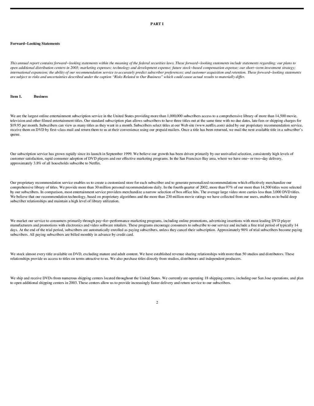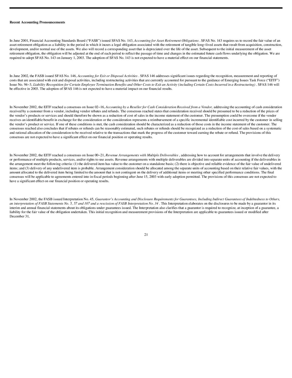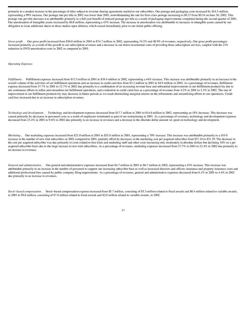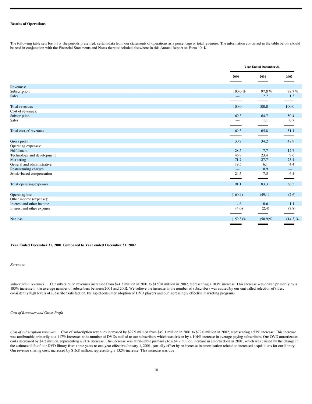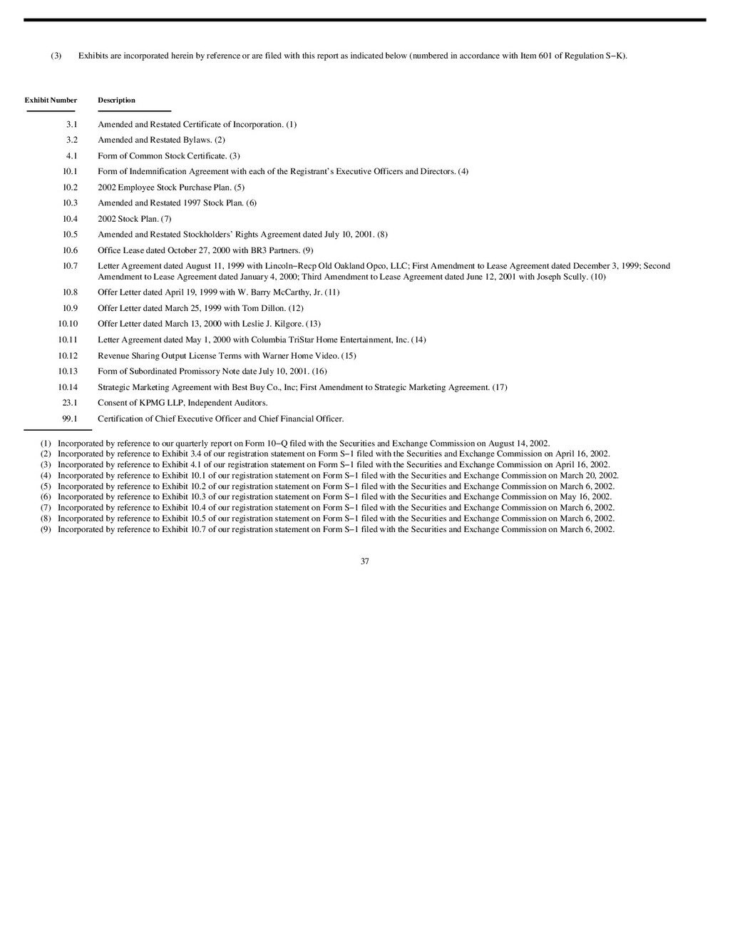 (in thousands, except share data) Convertible Preferred Stock Common Stock Additional Paid−in Capital Deferred Stock− Based Compen− sation Accumulated Other Compre− hensive Income Compre− hensive Loss Accum− ulated Deficit Total Stock− holders' (Deficit) Equity Shares Amount Shares Amount Balances as of January 1, 2000 4,444,545 $ 4 2,074,160 $ 2 $ 16,092 $ (6,841) $ — $ (41,285) $ (32,028) Exercise of options and issuance of restricted stock — — 81,003 — 422 — — — 422 Repurchase of restricted stock — — (26,653) — (141) — — — (141) Issuance of common stock in exchange for services rendered — — 7,258 — 306 — — — 306 Warrants issued in connection with operating lease — — — — 216 — — — 216 Warrants issued in connection with services rendered — — — — 285 — — — 285 Warrants issued in connection with debt financing — — — — 105 — — — 105 Subscribed Series F non−voting preferred stock — — — — 6,128 — — — 6,128 Deferred stock−based compensation, net — — — — 11,228 (11,228) — — — Stock−based compensation expense — — — — — 8,803 — — 8,803 Net loss — — — — — — — $ (57,363) (57,363) (57,363) Appreciation (depreciation) in value of available−for−sale securities — — — — — — — — — — Comprehensive loss — — — — — — — $ (57,363) — — Balances as of December 31, 2000 4,444,545 4 2,135,768 2 34,641 (9,266) — (98,648) (73,267) Exercise of options — — 30,046 — 125 — — — 125 Repurchase of restricted stock — — (5,625) — (12) — — — (12) Issuance of common stock in exchange for services rendered — — 1,666 — 10 — — — 10 Warrants issued in connection with subordinated notes payable — — — — 10,884 — — — 10,884 Warrants issued in connection with capital lease obligation — — — — 172 — — — 172 Warrants issued in exchange for services rendered — — — — 18 — — — 18 Issuance of Series F non−voting preferred stock 1,712,954 2 — — 4,279 — — — 4,281 Subscribed Series F non−voting preferred stock — — — — 217 — — — 217 Deferred stock−based compensation, net — — — — 2,145 (2,145) — — — Stock−based compensation expense — — — — — 5,686 — — 5,686 Net loss — — — — — — — $ (38,618) (38,618) (38,618) Appreciation (depreciation) in value of available−for−sale securities — — — — — — — — — — Comprehensive loss — — — — — — — $ (38,618) — — Balances as of December 31, 2001 6,157,499 6 2,161,855 2 52,479 (5,725) — (137,266) (90,504) Exercise of options — — 438,838 — 1,287 — — — 1,287 Issuance of common stock under Employee Stock Purchase Plan — — 47,746 — 363 — — — 363 Repurchase of restricted stock — — (1,729) — (6) — — — (6) Issuance of Series F non−voting preferred stock 3,492,737 4 — — 1,314 — — — 1,318 Issuance of common stock, net of costs — — 6,328,084 6 86,208 — — — 86,214 Conversion of preferred stock into common stock (9,650,236) (10) 3,216,740 3 7 — — — — Conversion of redeemable convertible preferred stock into common stock — — 9,659,700 10 101,820 — — — 101,830 Issuance of common stock upon exercise of warrants — — 594,561 1 195 — — — 196 Deferred stock−based compensation, net — — — — 15,505 (15,505) — — — Stock−based compensation expense — — — — — 9,831 — — 9,831 Net loss — — — — — — — $ (21,947) (21,947) (21,947) Appreciation (depreciation) in value of available−for−sale securities — — — — — — 774 774 — 774 Comprehensive loss — — — — — — — $ (21,173) — — Balances as of December 31, 2002 — $ — 22,445,795 $ 22 $ 259,172 $ (11,399) $ 774 $ (159,213) $ 89,356 See accompanying notes to financial statements. F−5