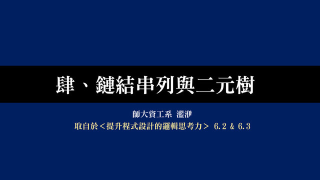 肆、鏈結串列與二元樹 師大資工系 灆洢 取自於<提升程式設計的邏輯思考力> 6.2 & 6.3