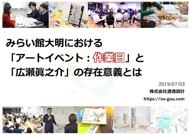 みらい館⼤明における 「アートイベント︓作業⽇」と 「広瀬眞之介」の存在意義とは 2019/07/03 株式会社遭遇設計 https://so-guu.com 0