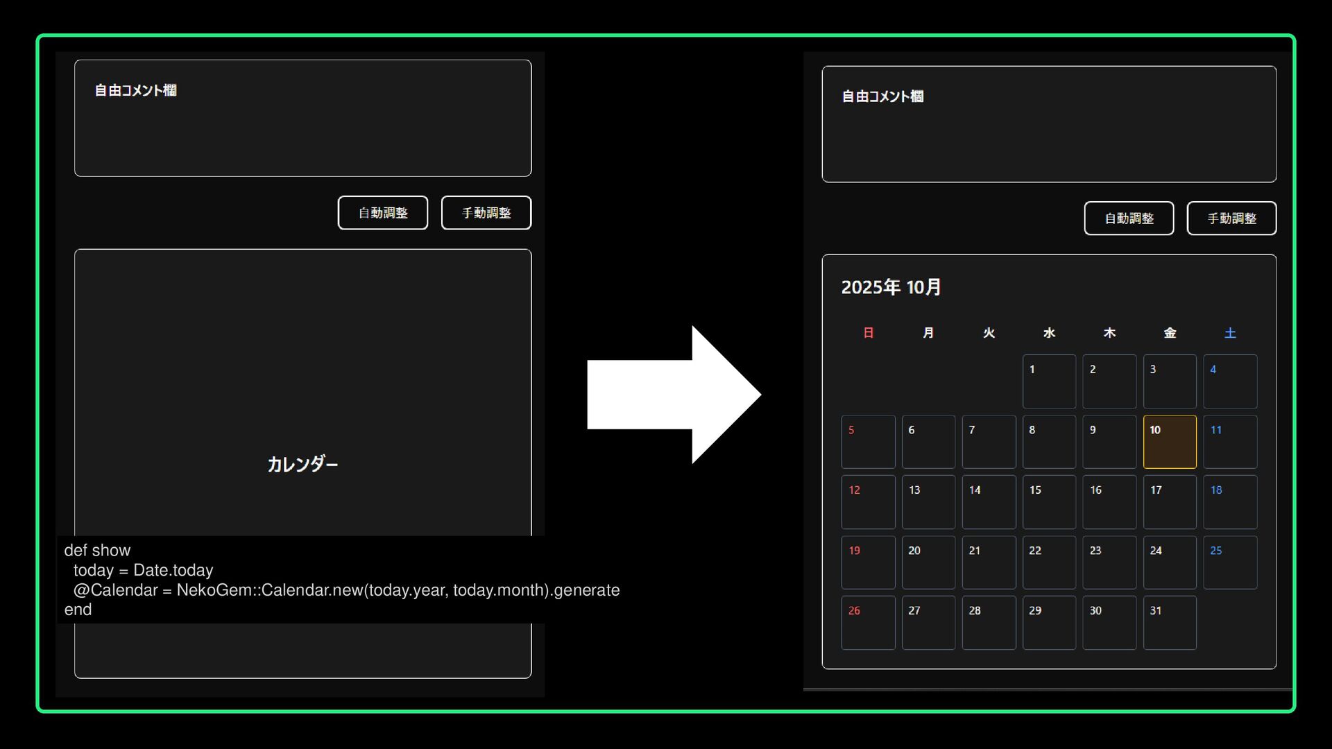 def show today = Date.today @Calendar = NekoGem::Calendar.new(today.year, today.month).generate end