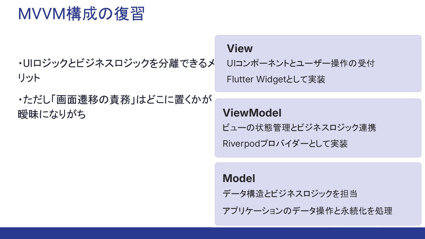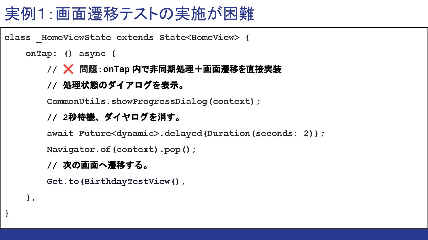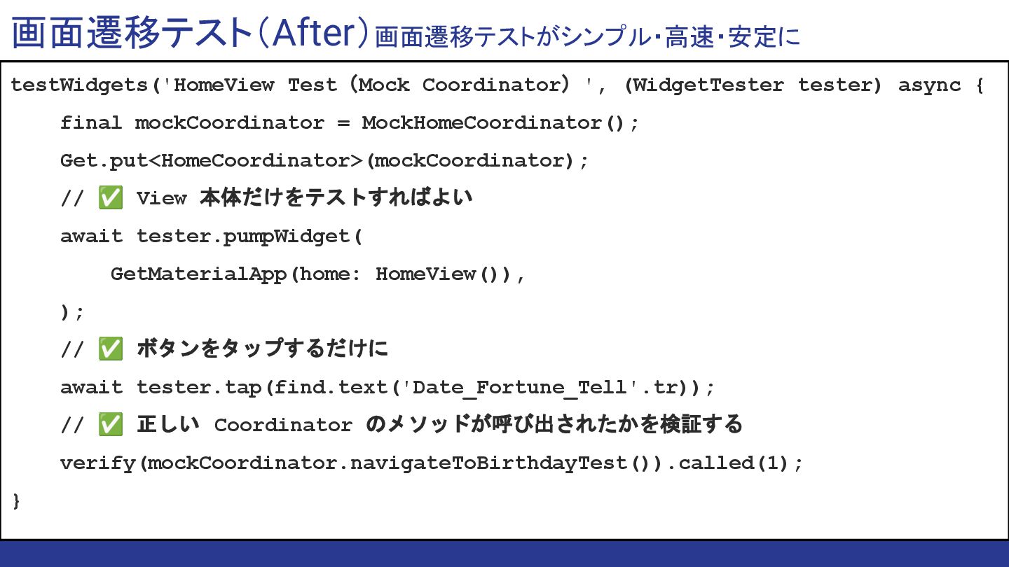 ❌ ルーティング設定 が必要です。 GetPage(name: '/birthday', page: () => BirthdayTestView()), GetPage(name: '/fingerprint', page: () => FingerPrintTestView()), ], await tester.tap(find.text('Date_Fortune_Tell'.tr)); await tester.pump(Duration(seconds: 2)); // ❌ 2秒を待つ必要。 await tester.pumpAndSettle(); //❌ アニメーション完了を 待つ必要。 // ❌ 正しいページに遷移したかどうかを検証するのが難しい。 expect(find.byType(BirthdayTestView), findsOneWidget); }