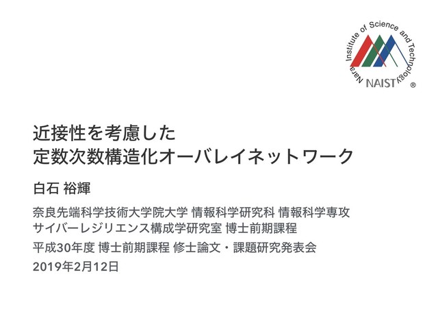 ҙͷਖ਼ଇάϥϑʹجͮ͘ఆ࣍ΦʔόϨΠ͕ߏஙՄೳ ‣ ྫ: Kautz άϥϑʹجͮ͘ DLG-Kautz [3] 8 ࢄϥΠϯάϥϑ [7], [8] [7] Y. Zhang and L. Liu, “Distributed Line Graphs: A Universal Technique for Designing DHTs Based on Arbitrary Regular Graphs,” IEEE Trans. Knowl. Data Eng., vol. 24, no. 9, pp. 1556–1569, Sep. 2012. [8] A. Manada and H. Morita, “Graph Theoretical Analysis on Distributed Line Graphs for Peer-to-Peer Networks,” IEEE Trans. Netw. Sci. Eng., pp. 1–1, 2018. [3] Y. Zhang, X. Lu, and D. Li, “SKY: Efficient Peer-to-Peer Networks Based on Distributed Kautz Graphs,” Sci. China Ser. F Inf. Sci., vol. 52, no. 4, pp. 588–601, Apr. 2009.
