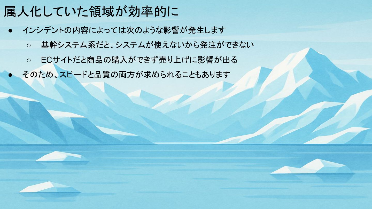 属人化していた領域が効率的に • インシデントの内容によっては次のような影響が発生します ◦ 基幹システム系だと、システムが使えないから発注ができない ◦ ECサイトだと商品の購入ができず売り上げに影響が出る • そのため、スピードと品質の両方が求められることもあります