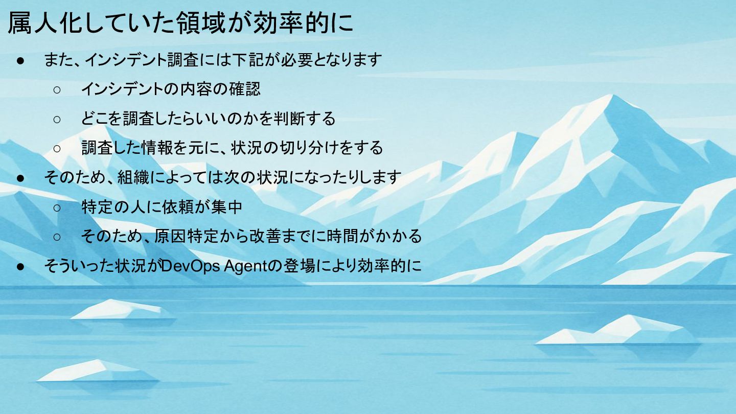 そのため、組織によっては次の状況になったりします ◦ 特定の人に依頼が集中 ◦ そのため、原因特定から改善までに時間がかかる • そういった状況がDevOps Agentの登場により効率的に