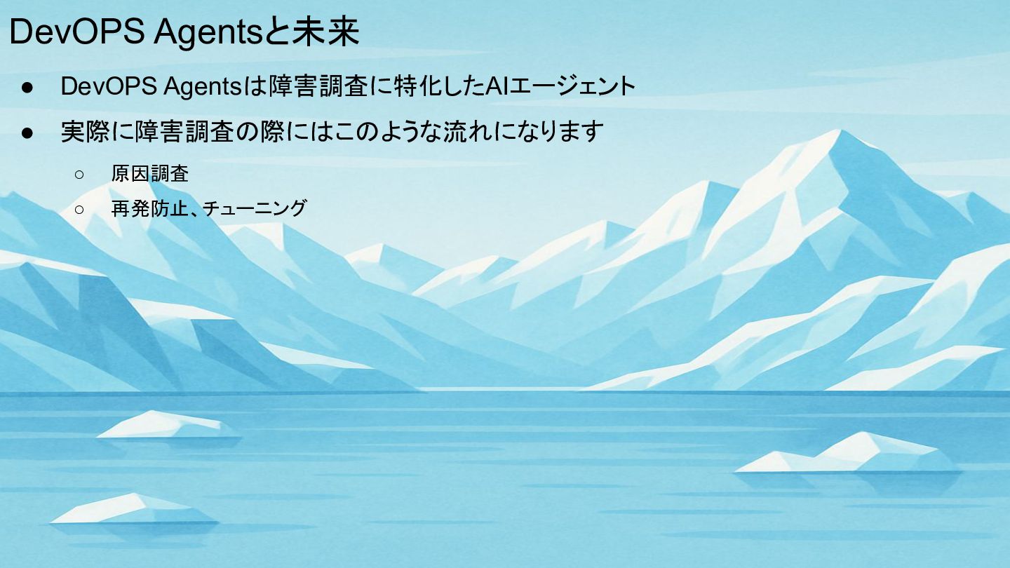 DevOPS Agentsと未来 • DevOPS Agentsは障害調査に特化したAIエージェント • 実際に障害調査の際にはこのような流れになります ◦ 原因調査 ◦