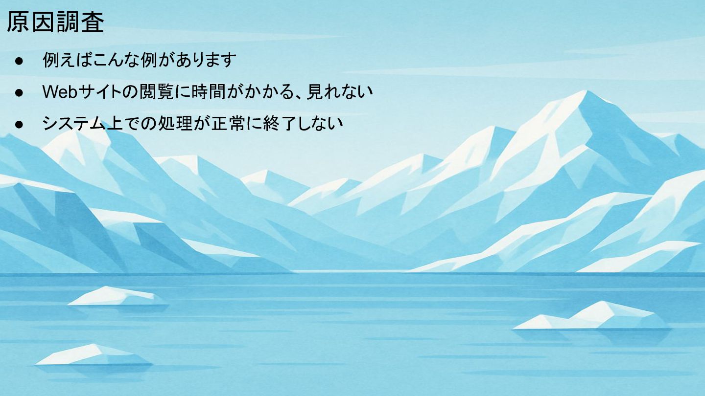 原因調査 • 例えばこんな例があります • Webサイトの閲覧に時間がかかる、見れない • システム上での処理が正常に終了しない