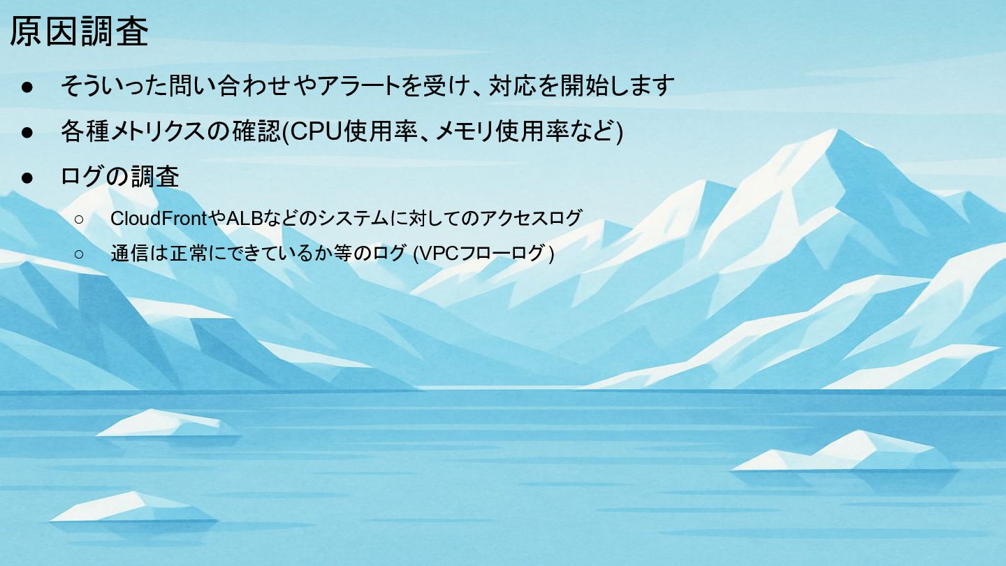 原因調査 • そういった問い合わせやアラートを受け、対応を開始します • 各種メトリクスの確認(CPU使用率、メモリ使用率など) • ログの調査 ◦ CloudFrontやALBなどのシステムに対してのアクセスログ ◦