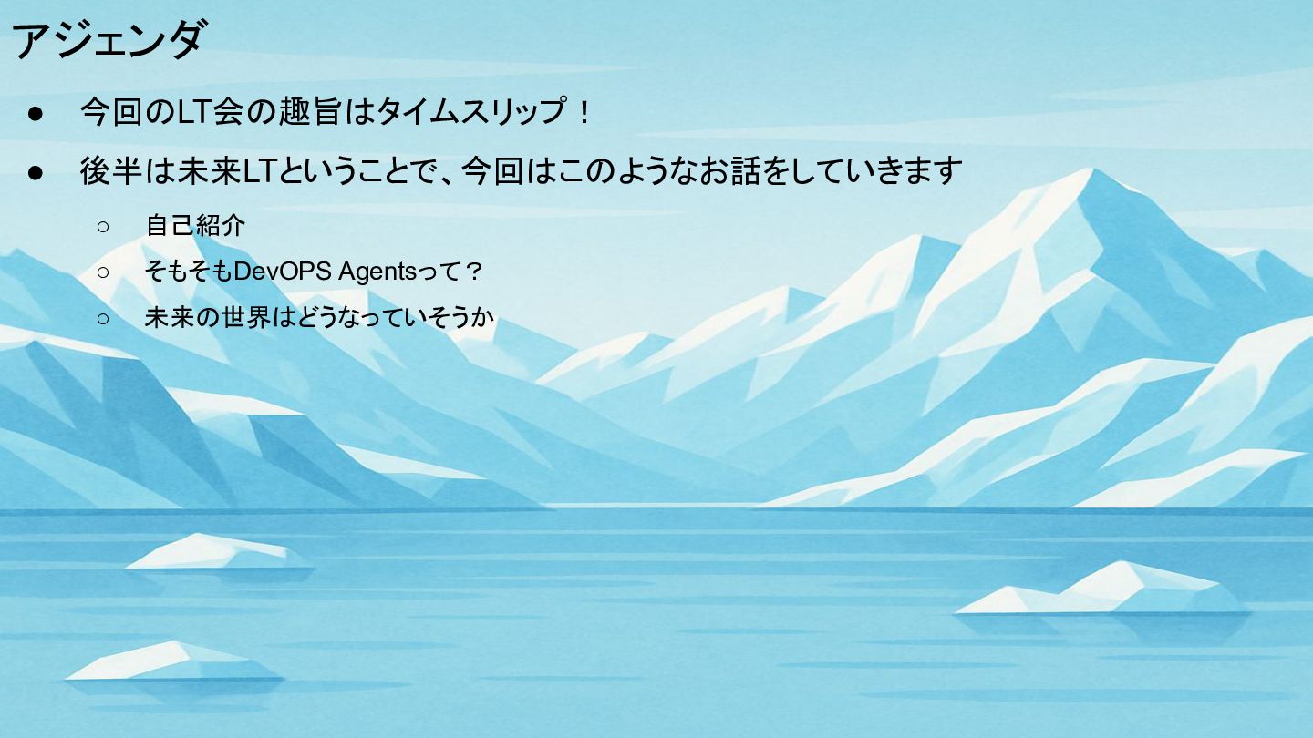 アジェンダ • 今回のLT会の趣旨はタイムスリップ! • 後半は未来LTということで、今回はこのようなお話をしていきます ◦ 自己紹介 ◦ そもそもDevOPS Agentsって?