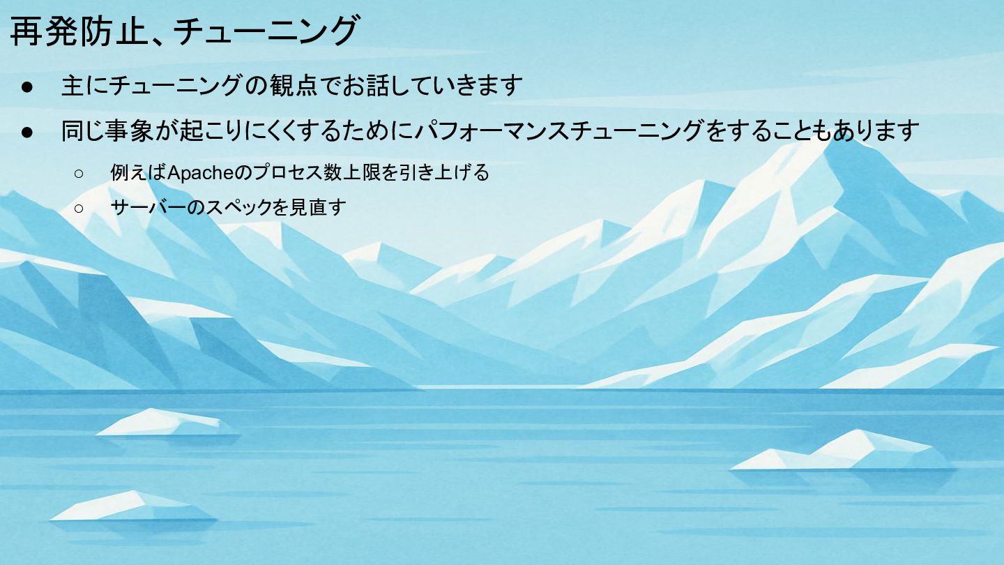 再発防止、チューニング • 主にチューニングの観点でお話していきます • 同じ事象が起こりにくくするためにパフォーマンスチューニングをすることもあります ◦ 例えばApacheのプロセス数上限を引き上げる ◦ サーバーのスペックを見直す