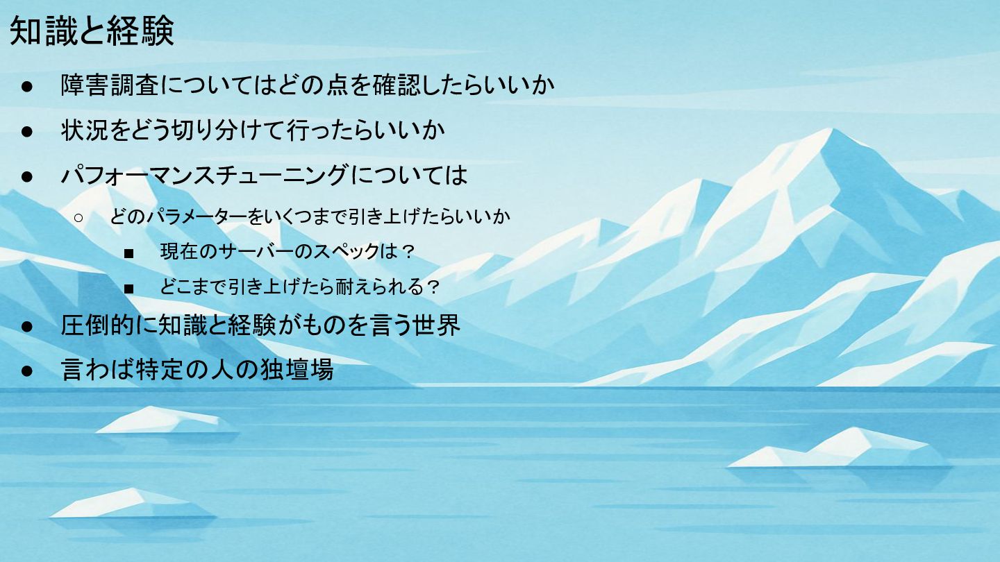 知識と経験 • 障害調査についてはどの点を確認したらいいか • 状況をどう切り分けて行ったらいいか • パフォーマンスチューニングについては ◦ どのパラメーターをいくつまで引き上げたらいいか ▪