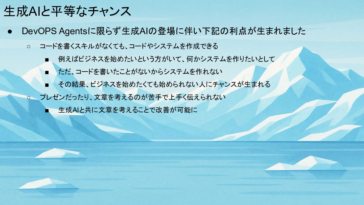 生成AIと平等なチャンス • DevOPS Agentsに限らず生成AIの登場に伴い下記の利点が生まれました ◦ コードを書くスキルがなくても、コードやシステムを作成できる ▪ 例えばビジネスを始めたいという方がいて、何かシステムを作りたいとして ▪ ただ、コードを書いたことがないからシステムを作れない
