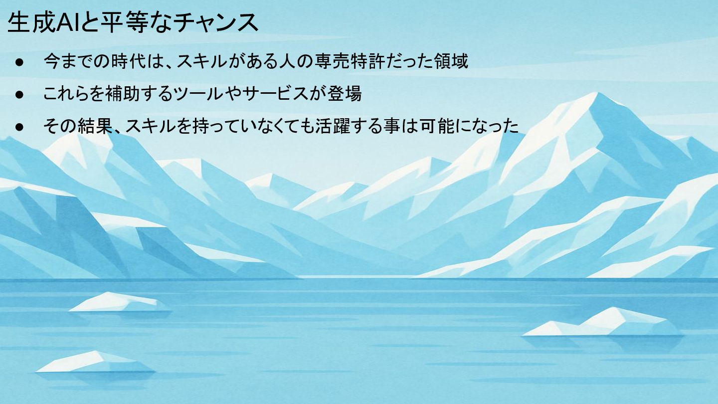 生成AIと平等なチャンス • 今までの時代は、スキルがある人の専売特許だった領域 • これらを補助するツールやサービスが登場 • その結果、スキルを持っていなくても活躍する事は可能になった