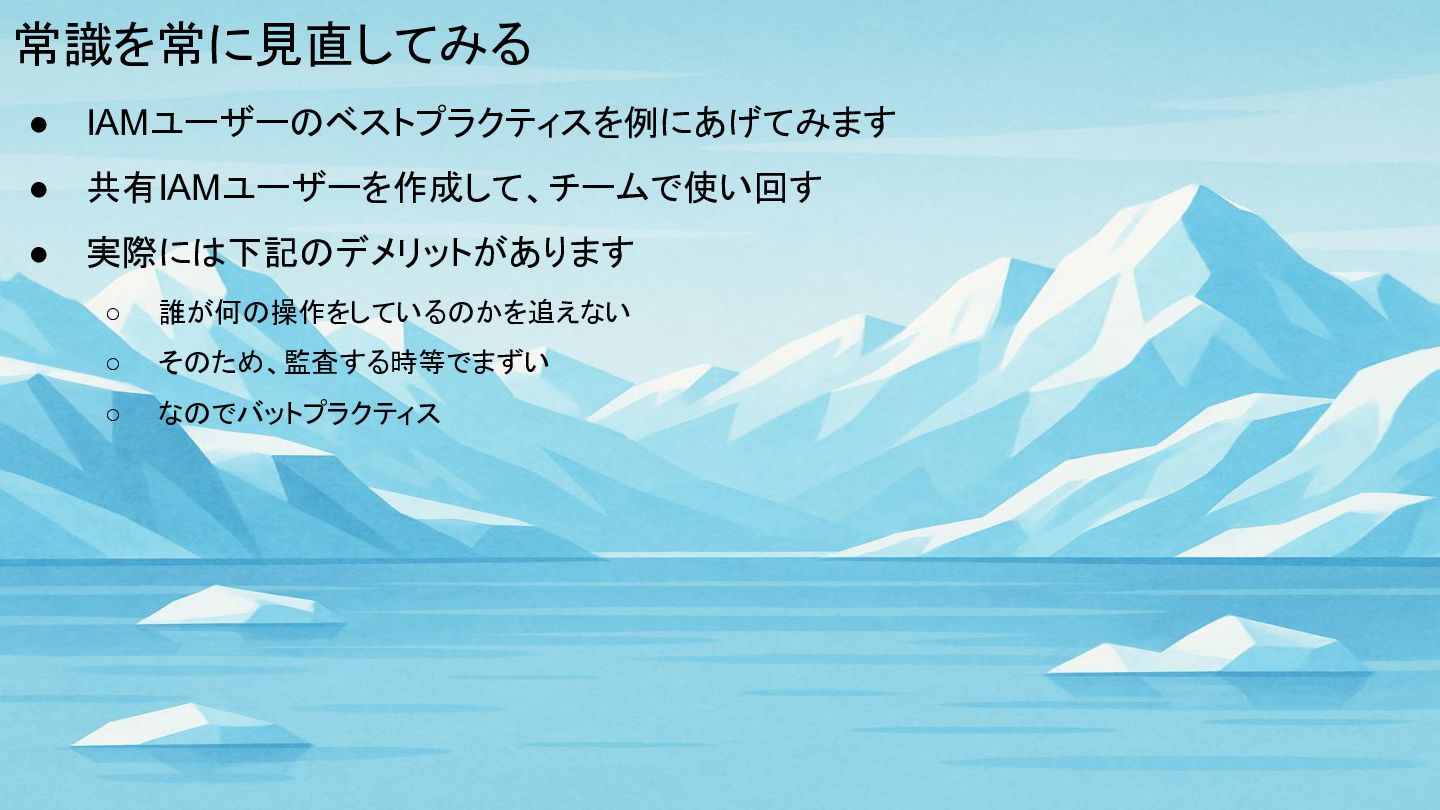常識を常に見直してみる • IAMユーザーのベストプラクティスを例にあげてみます • 共有IAMユーザーを作成して、チームで使い回す • 実際には下記のデメリットがあります ◦ 誰が何の操作をしているのかを追えない ◦