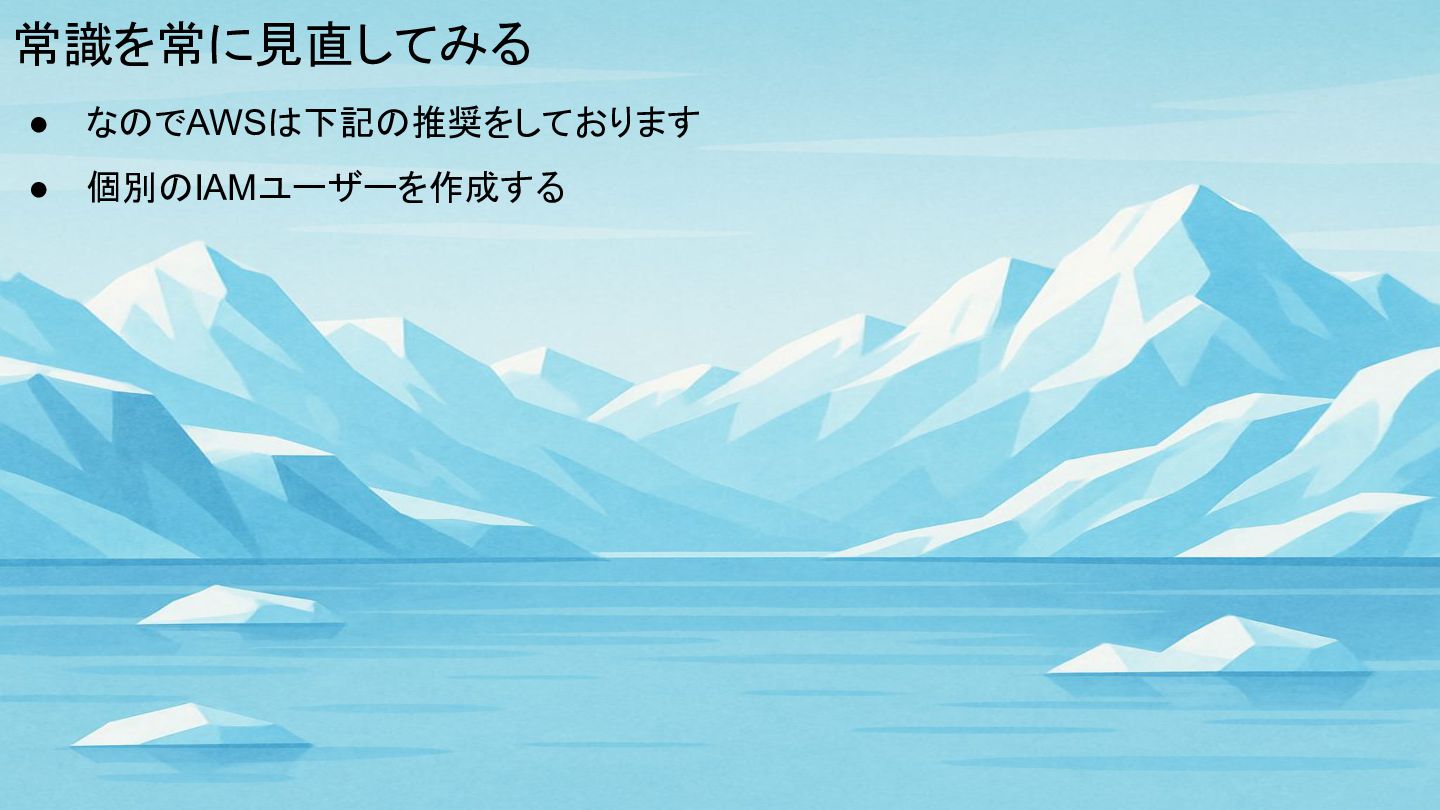 常識を常に見直してみる • なのでAWSは下記の推奨をしております • 個別のIAMユーザーを作成する