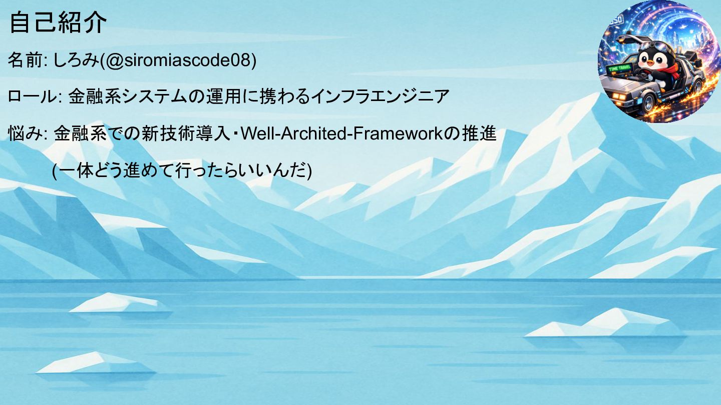 自己紹介 名前: しろみ(@siromiascode08) ロール: 金融系システムの運用に携わるインフラエンジニア 悩み: 金融系での新技術導入・Well-Archited-Frameworkの推進 (一体どう進めて行ったらいいんだ)