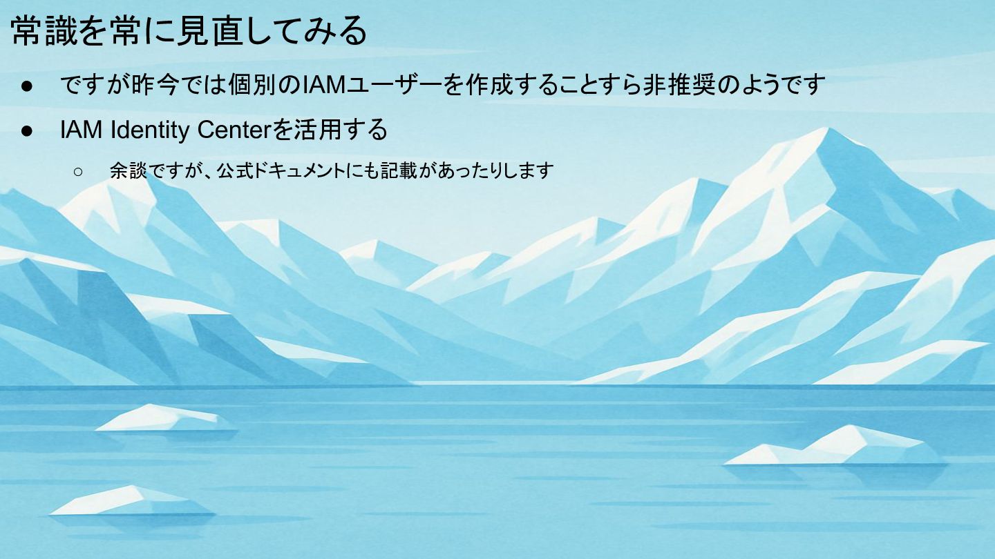常識を常に見直してみる • ですが昨今では個別のIAMユーザーを作成することすら非推奨のようです • IAM Identity Centerを活用する ◦ 余談ですが、公式ドキュメントにも記載があったりします