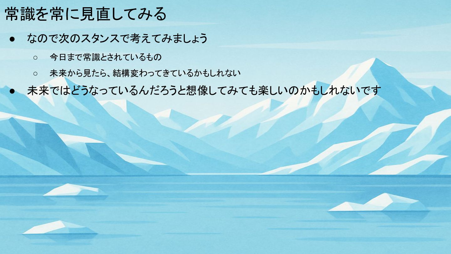 常識を常に見直してみる • なので次のスタンスで考えてみましょう ◦ 今日まで常識とされているもの ◦ 未来から見たら、結構変わってきているかもしれない • 未来ではどうなっているんだろうと想像してみても楽しいのかもしれないです