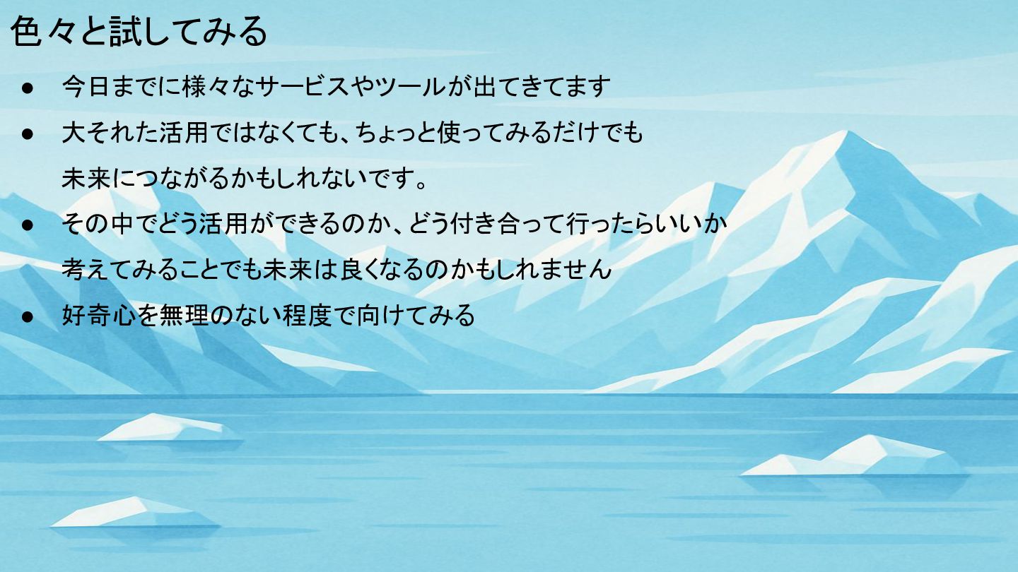 色々と試してみる • 今日までに様々なサービスやツールが出てきてます • 大それた活用ではなくても、ちょっと使ってみるだけでも 未来につながるかもしれないです。 • その中でどう活用ができるのか、どう付き合って行ったらいいか 考えてみることでも未来は良くなるのかもしれません •