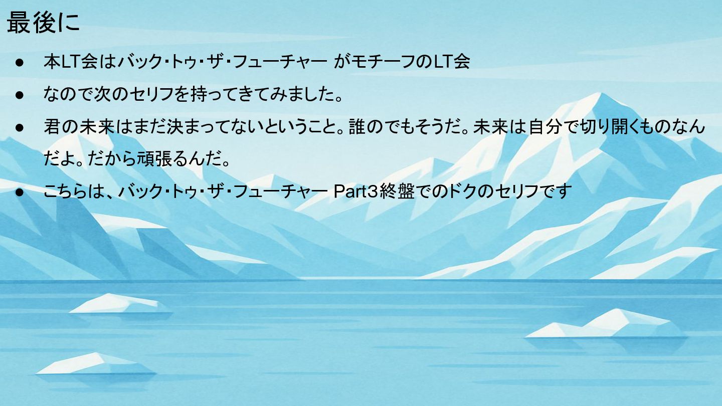最後に • 本LT会はバック・トゥ・ザ・フューチャー がモチーフのLT会 • なので次のセリフを持ってきてみました。 • 君の未来はまだ決まってないということ。誰のでもそうだ。未来は自分で切り開くものなん だよ。だから頑張るんだ。 •