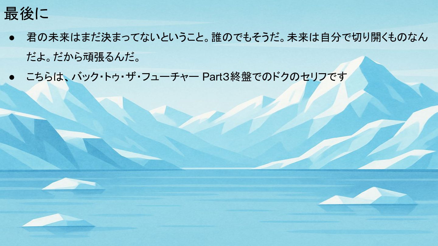 最後に • 君の未来はまだ決まってないということ。誰のでもそうだ。未来は自分で切り開くものなん だよ。だから頑張るんだ。 • こちらは、バック・トゥ・ザ・フューチャー Part3終盤でのドクのセリフです