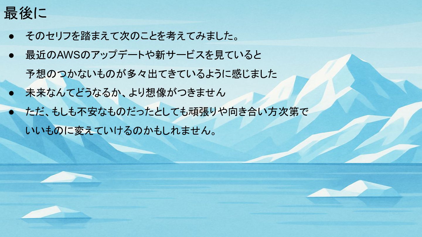 最後に • そのセリフを踏まえて次のことを考えてみました。 • 最近のAWSのアップデートや新サービスを見ていると 予想のつかないものが多々出てきているように感じました • 未来なんてどうなるか、より想像がつきません • ただ、もしも不安なものだったとしても頑張りや向き合い方次第で