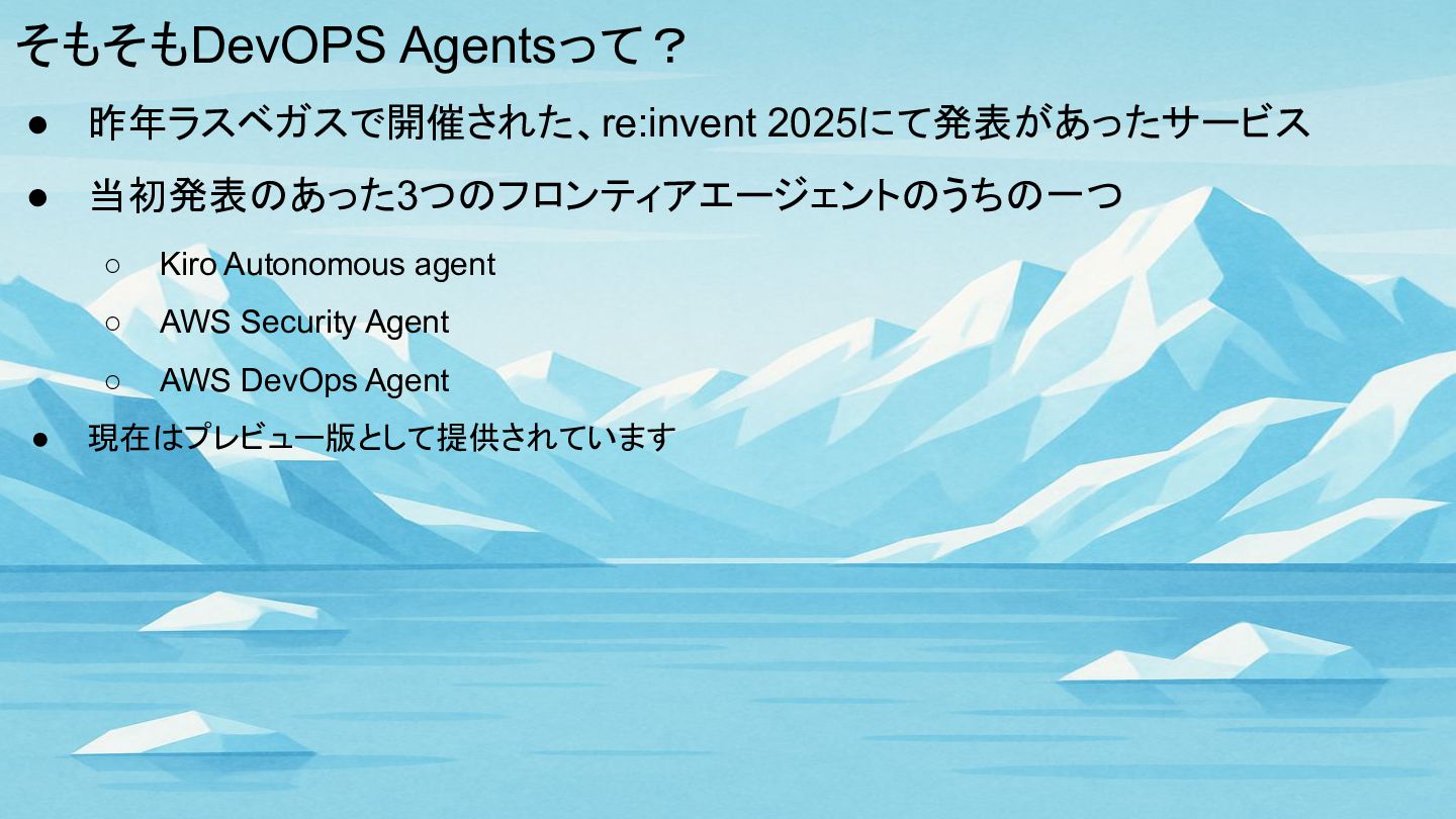 そもそもDevOPS Agentsって? • 昨年ラスベガスで開催された、re:invent 2025にて発表があったサービス • 当初発表のあった3つのフロンティアエージェントのうちの一つ ◦ Kiro Autonomous