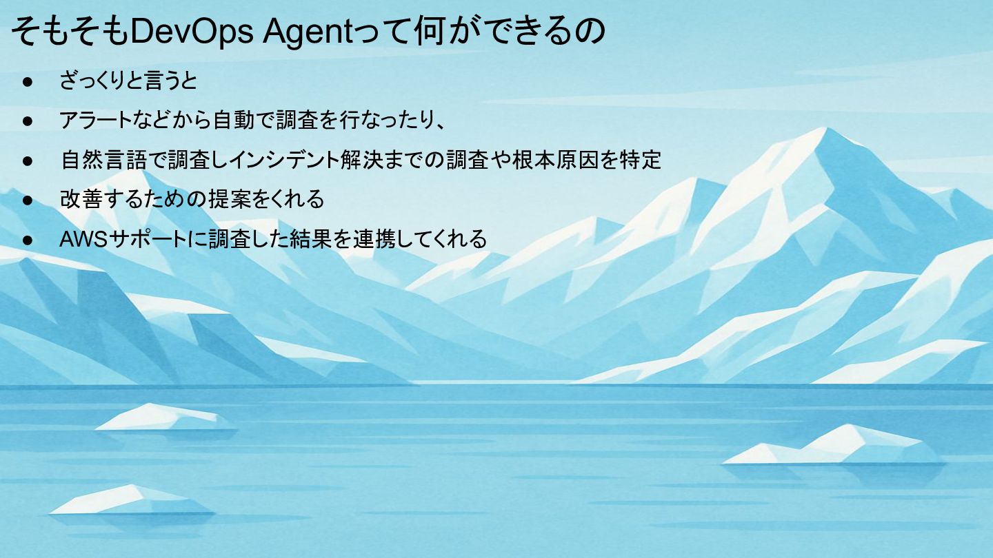 そもそもDevOps Agentって何ができるの • ざっくりと言うと • アラートなどから自動で調査を行なったり、 • 自然言語で調査しインシデント解決までの調査や根本原因を特定 • 改善するための提案をくれる